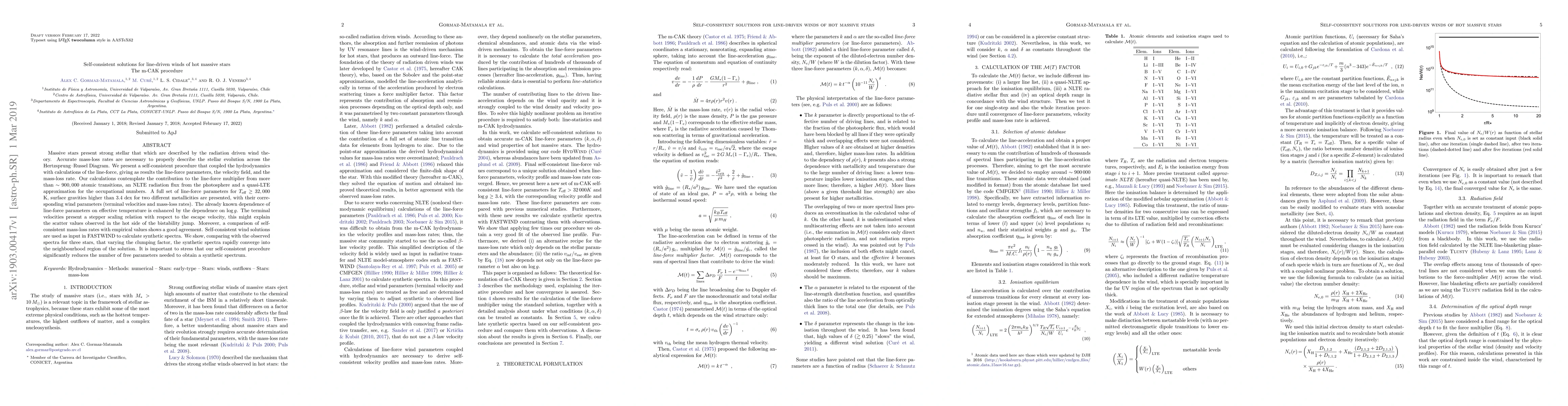 Massive stars present strong stellar that which are described by the radiation driven wind theory. Accurate mass-loss rates are necessary to properly describe the stellar evolution across the Hertzsprung--Russel Diagram. We present a self-consistent procedure that coupled the hydrodynamics with calculations of the line-force, giving as results the line-force parameters, the velocity field, and the mass-loss rate. Our calculations contemplate the contribution to the line-force multiplier from more than $\sim 900,000$ atomic transitions, an NLTE radiation flux from the photosphere and a quasi-LTE approximation for the occupational numbers. A full set of line-force parameters for $T_\text{eff}\ge 32,000$ K, surface gravities higher than 3.4 dex for two different metallicities are presented, with their corresponding wind parameters (terminal velocities and mass-loss rates). The already known dependence of line-force parameters on effective temperature is enhanced by the dependence on $\log g$. The terminal velocities present a stepper scaling relation with respect to the escape velocity, this might explain the scatter values observed in the hot side of the bistability jump. Moreover, a comparison of self-consistent mass-loss rates with empirical values shows a good agreement. Self-consistent wind solutions are used as input in FASTWIND to calculate synthetic spectra. We show, comparing with the observed spectra for three stars, that varying the clumping factor, the synthetic spectra rapidly converge into the neighbourhood region of the solution. It is important to stress that our self-consistent procedure significantly reduces the number of free parameters needed to obtain a synthetic spectrum.