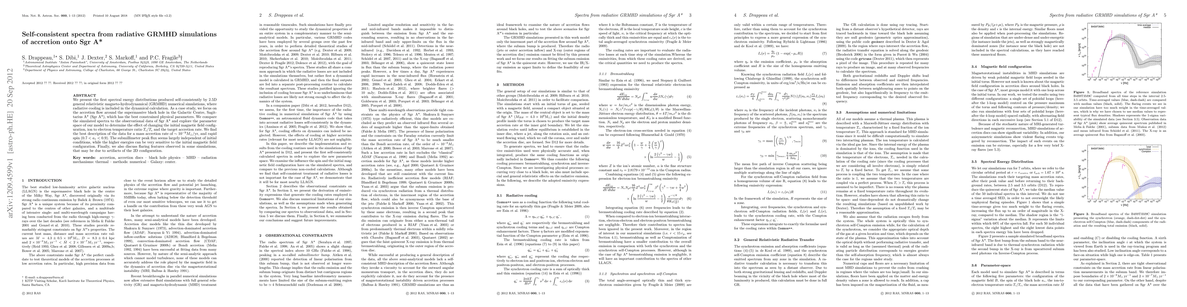 This paper presents self-consistent spectral energy distributions from 2.5D GRMHD simulations of accretion onto Sgr A*, including radiative cooling. The best fit to observational data is found for a mass accretion rate of ~1e-9 Msun/yr and a rapid black hole spin, while the submillimeter peak flux is largely independent of initial conditions.