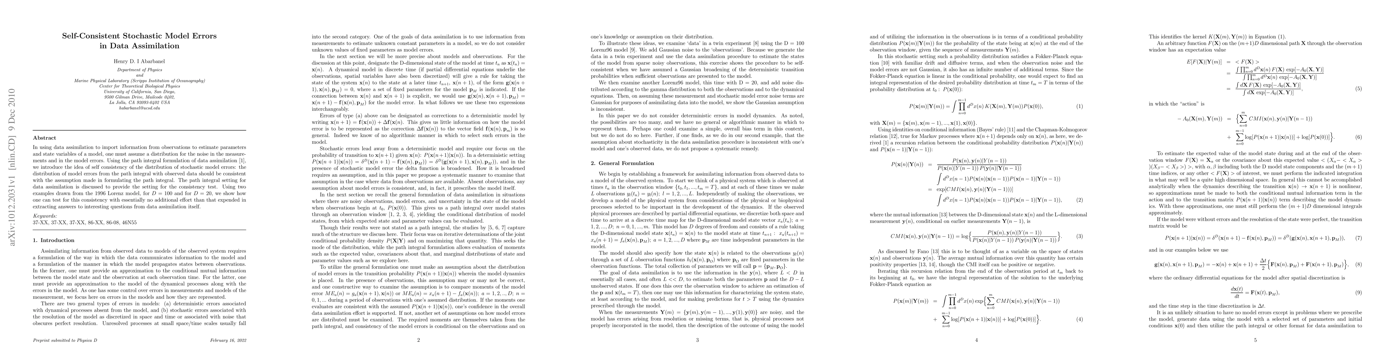 In using data assimilation to import information from observations to estimate parameters and state variables of a model, one must assume a distribution for the noise in the measurements and in the model errors. Using the path integral formulation of data assimilation~ cite{abar2009}, we introduce the idea of self consistency of the distribution of stochastic model errors: the distribution of model errors from the path integral with observed data should be consistent with the assumption made in formulating the the path integral. The path integral setting for data assimilation is discussed to provide the setting for the consistency test. Using two examples drawn from the 1996 Lorenz model, for $D = 100$ and for $D = 20$ we show how one can test for this inconsistency with essential no additional effort than that expended in extracting answers to interesting questions from data assimilation itself. \end{abstract}