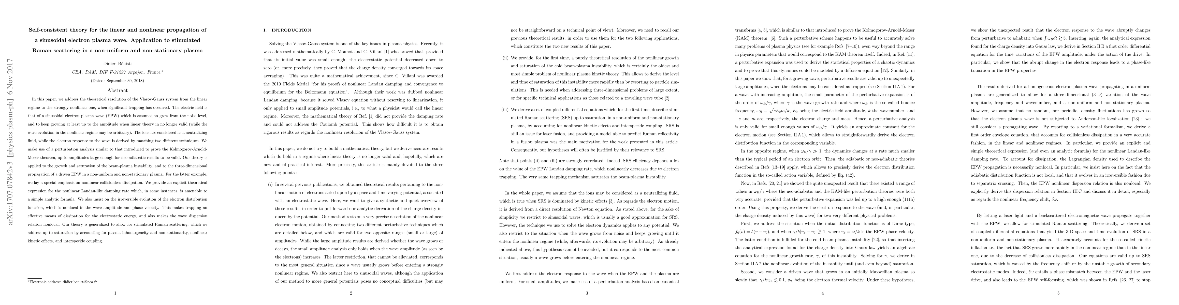 In this paper, we address the theoretical resolution of the Vlasov-Gauss system from the linear regime to the strongly nonlinear one, when significant trapping has occurred. The electric field is that of a sinusoidal electron plasma wave (EPW) which is assumed to grow from the noise level, and to keep growing at least up to the amplitude when linear theory in no longer valid (while the wave evolution in the nonlinear regime may be arbitrary). The ions are considered as a neutralizing fluid, while the electron response to the wave is derived by matching two different techniques. We make use of a perturbation analysis similar to that introduced to prove the Kolmogorov-Arnold- Moser theorem, up to amplitudes large enough for neo-adiabatic results to be valid. Our theory is applied to the growth and saturation of the beam-plasma instability, and to the three-dimensional propagation of a driven EPW in a non-uniform and non-stationary plasma. For the latter example, we lay a special emphasis on nonlinear collisionless dissipation. We provide an explicit theoretical expression for the nonlinear Landau-like damping rate which, in some instances, is amenable to a simple analytic formula. We also insist on the irreversible evolution of the electron distribution function, which is nonlocal in the wave amplitude and phase velocity. This makes trapping an effective means of dissipation for the electrostatic energy, and also makes the wave dispersion relation nonlocal. Our theory is generalized to allow for stimulated Raman scattering, which we address up to saturation by accounting for plasma inhomogeneity and non-stationarity, nonlinear kinetic effects, and interspeckle coupling.