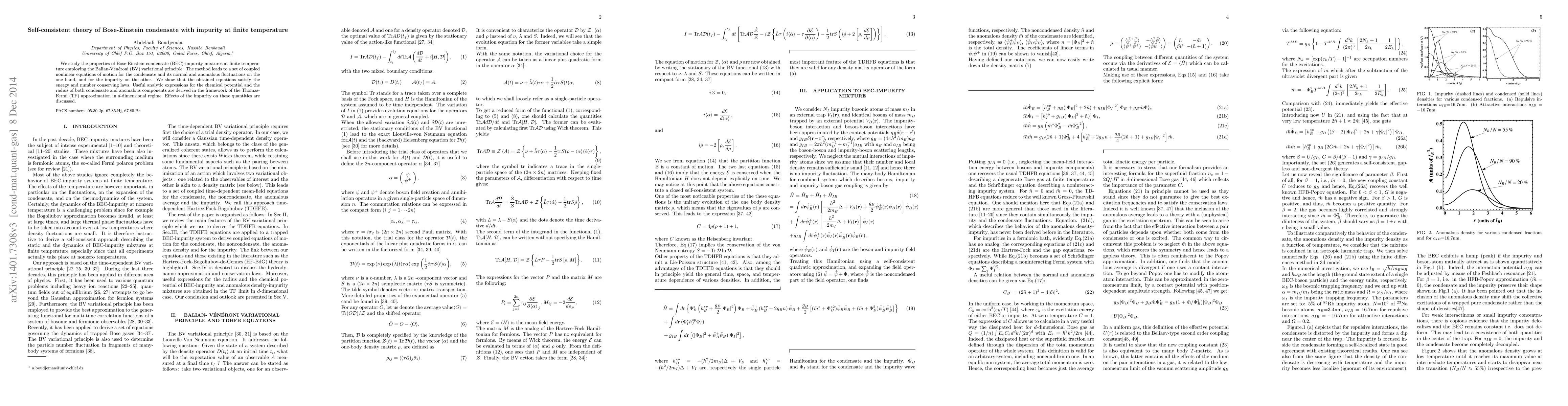 This paper develops a self-consistent theory for Bose-Einstein condensates mixed with impurities at finite temperatures using the Balian-Véneron variational principle, deriving coupled nonlinear equations and showing energy and number conservation. Analytical expressions for chemical potential and radius are derived in the Thomas-Fermi approximation, with discussions on impurity effects.