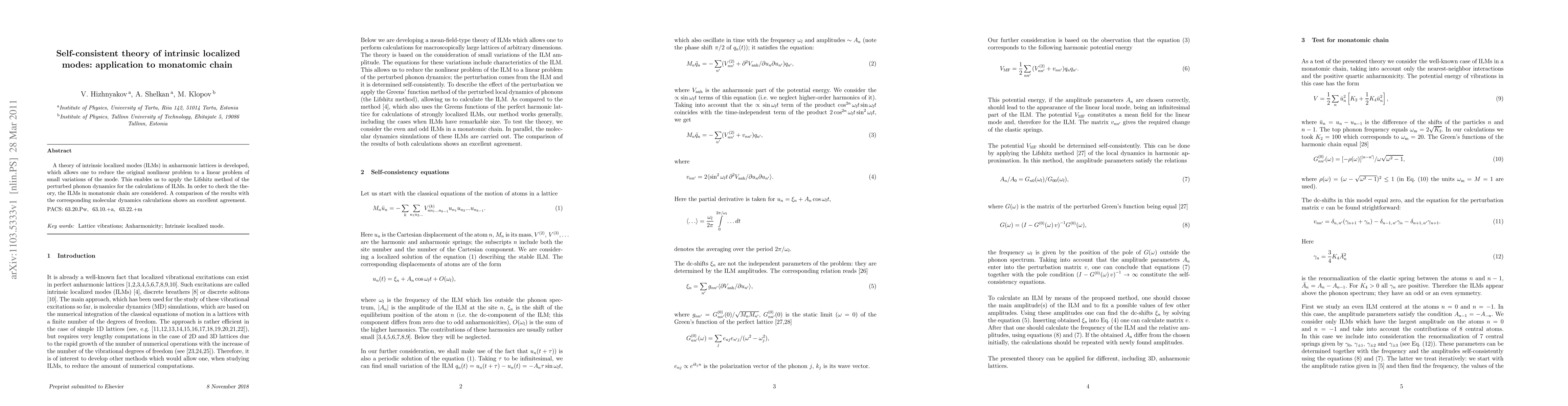 The paper develops a self-consistent theory for intrinsic localized modes (ILMs) in anharmonic lattices, reducing the problem to a linear one for analysis using the Lifshitz method. The theory is validated by applying it to a monatomic chain, where results match closely with molecular dynamics simulations.