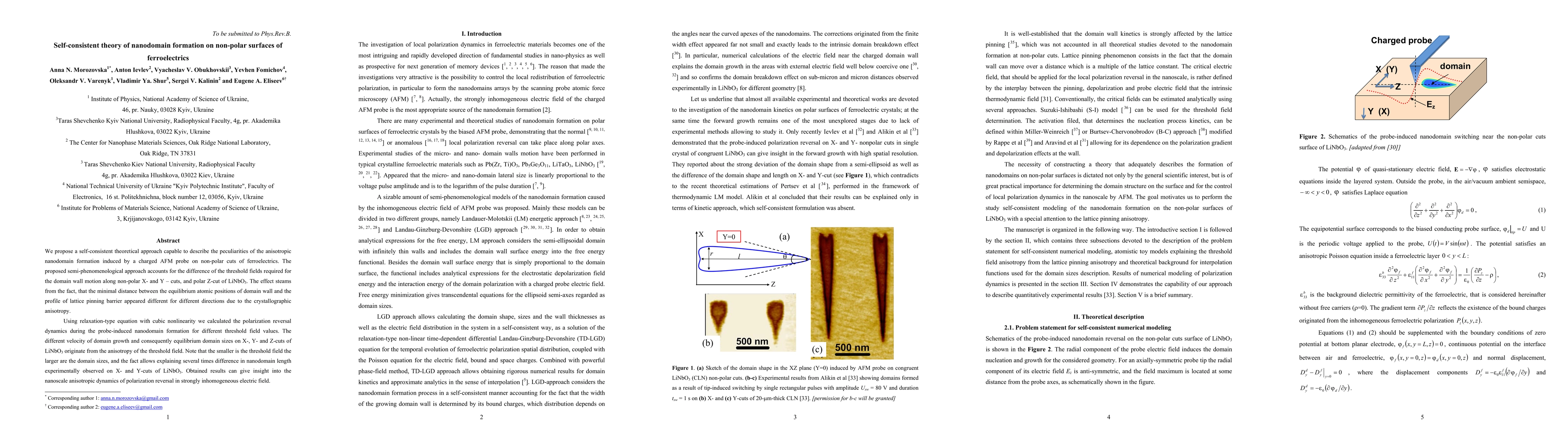 This paper proposes a self-consistent theoretical framework to describe anisotropic nanodomain formation on non-polar ferroelectric surfaces induced by a charged AFM probe. The model accounts for the differing threshold fields for domain wall motion along different crystallographic directions in LiNbO3, explaining the observed anisotropy in nanodomain sizes.