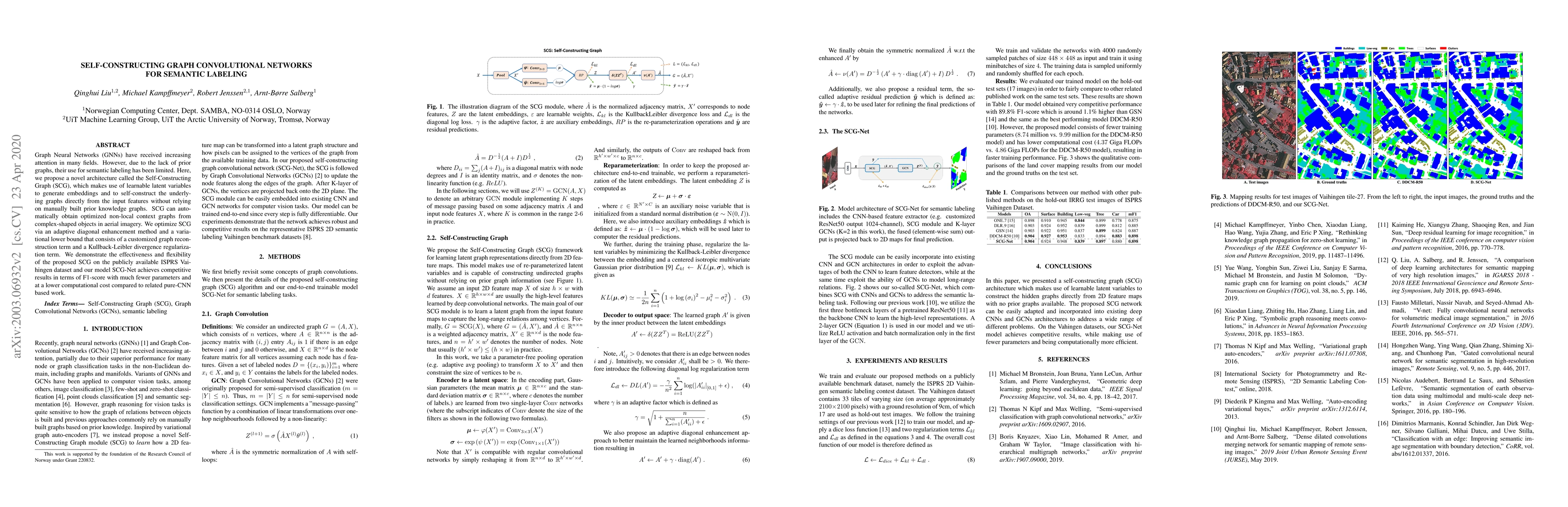 Graph Neural Networks (GNNs) have received increasing attention in many fields. However, due to the lack of prior graphs, their use for semantic labeling has been limited. Here, we propose a novel architecture called the Self-Constructing Graph (SCG), which makes use of learnable latent variables to generate embeddings and to self-construct the underlying graphs directly from the input features without relying on manually built prior knowledge graphs. SCG can automatically obtain optimized non-local context graphs from complex-shaped objects in aerial imagery. We optimize SCG via an adaptive diagonal enhancement method and a variational lower bound that consists of a customized graph reconstruction term and a Kullback-Leibler divergence regularization term. We demonstrate the effectiveness and flexibility of the proposed SCG on the publicly available ISPRS Vaihingen dataset and our model SCG-Net achieves competitive results in terms of F1-score with much fewer parameters and at a lower computational cost compared to related pure-CNN based work. Our code will be made public soon.