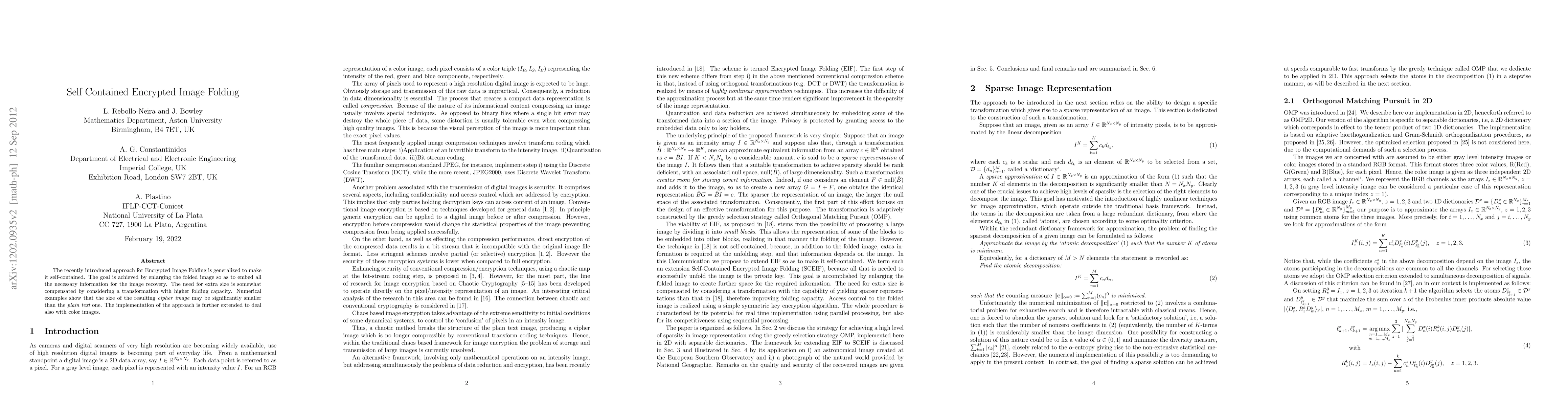 The recently introduced approach for Encrypted Image Folding is generalized to make it Self Contained. The goal is achieved by enlarging the folded image so as to embed all the necessary information for the image recovery. The need for extra size is somewhat compensated by considering a transformation with higher folding capacity. Numerical examples show that the size of the resulting cipher image may be significantly smaller than the plain text one. The implementation of the approach is further extended to deal also with color images.