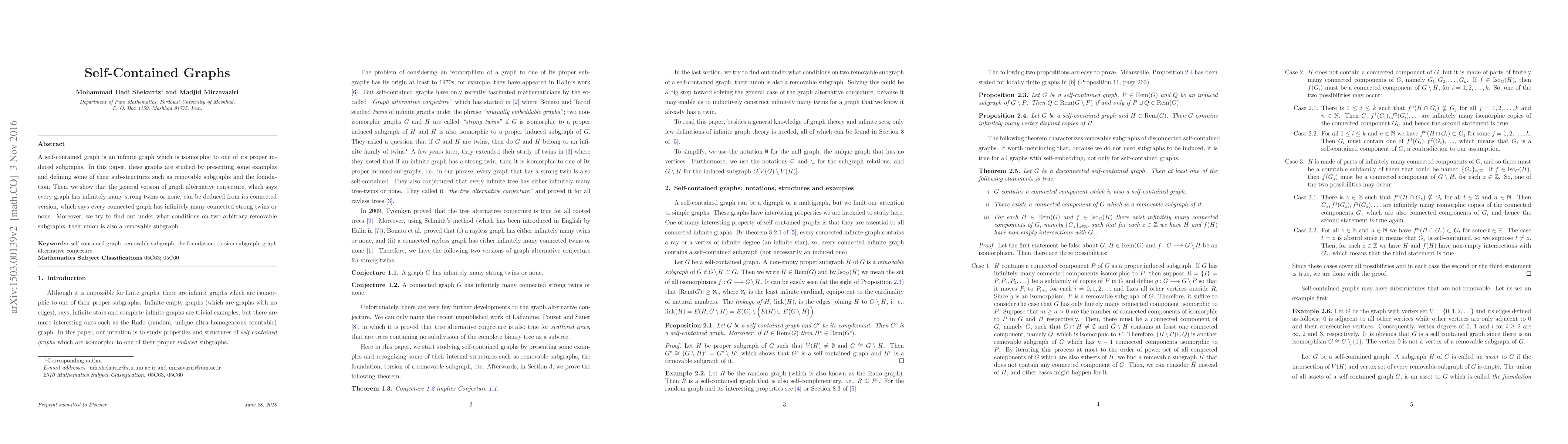 A self-contained graph is an infinite graph which is isomorphic to one of its proper induced subgraphs. In this paper, these graphs are studied by presenting some examples and defining some of their sub-structures such as removable subgraphs and the foundation. Then, we show that the general version of graph alternative conjecture, which says every graph has infinitely many strong twins or none, can be deduced from its connected version, which says every connected graph has infinitely many connected strong twins or none. Moreover, we try to find out under what conditions on two arbitrary removable subgraphs, their union is also a removable subgraph.