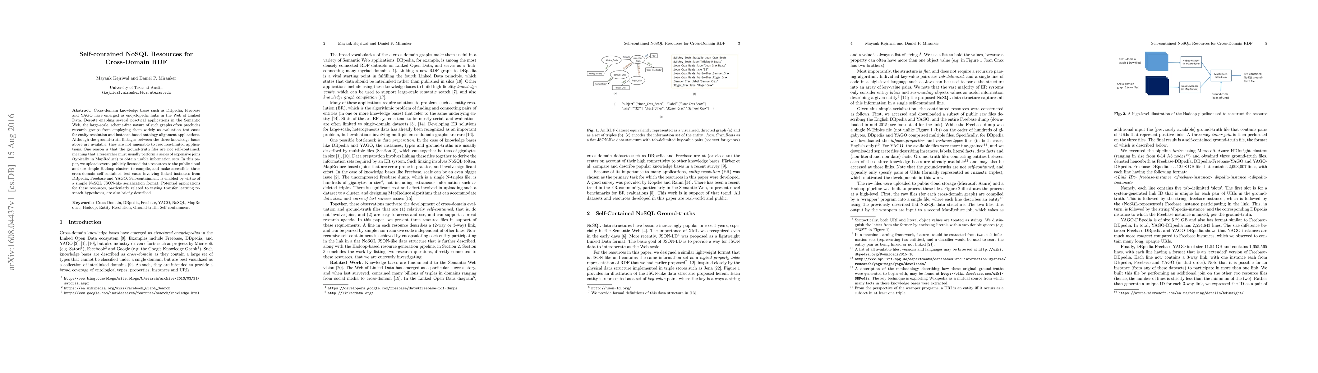 This paper presents self-contained NoSQL resources for cross-domain RDF, enabling easier access to linked instances from DBpedia, Freebase, and YAGO. The resources are compiled using Hadoop clusters and aim to facilitate research in entity resolution and ontology alignment without requiring extensive data joins.