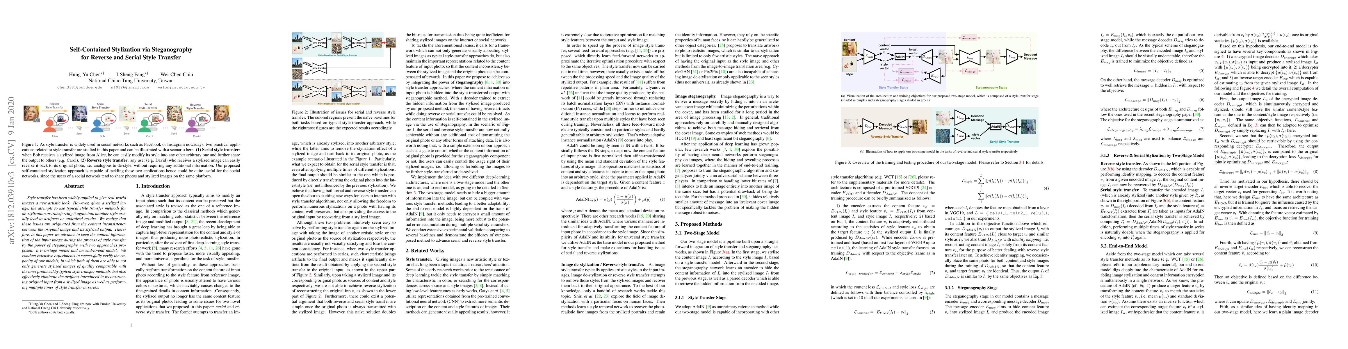 This paper proposes two models—a two-stage and an end-to-end model—that use steganography to maintain content consistency during style transfer, enabling effective reverse and serial style transfers without artifacts. Experiments show these models generate high-quality stylized images and mitigate issues in de-stylization and multi-style transfers.