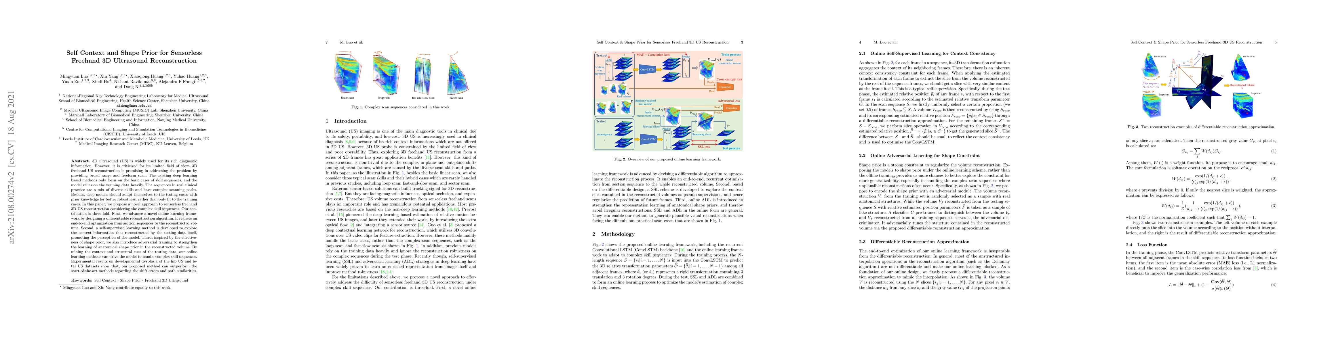 This paper proposes a novel sensorless freehand 3D ultrasound reconstruction method that addresses the limitations of existing deep learning approaches. It introduces an online learning framework, self-supervised learning, and adversarial training to enhance robustness and adaptability to complex skill sequences, outperforming state-of-the-art methods in reconstruction accuracy.