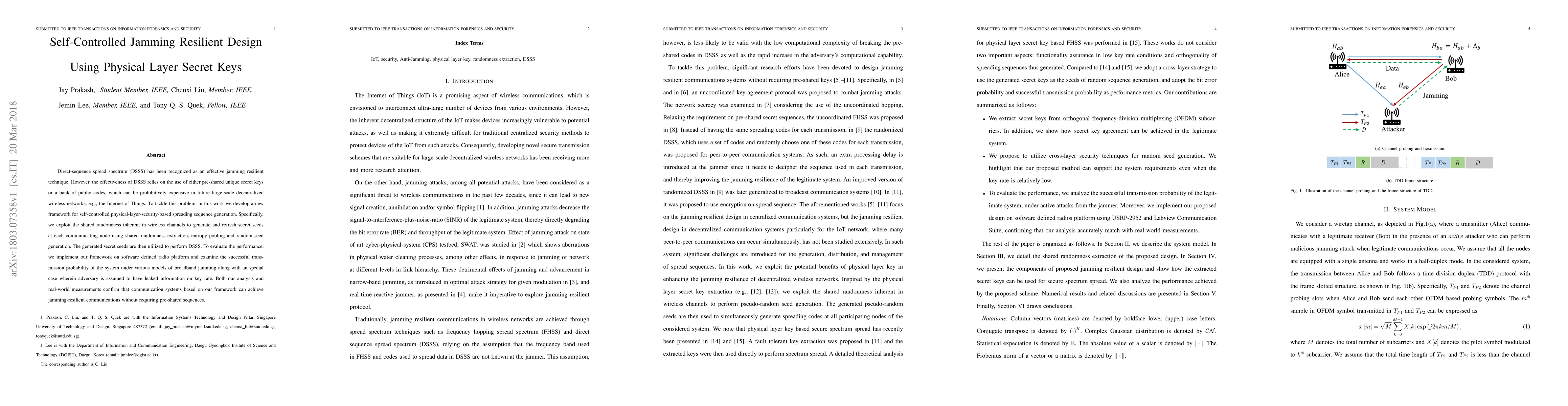 This paper proposes a self-controlled jamming-resilient design using physical layer secret keys, leveraging shared randomness in wireless channels to generate and refresh secret keys for direct-sequence spread spectrum (DSSS) without pre-shared sequences. Experimental results on a software-defined radio platform demonstrate successful transmission probability under various jamming conditions.