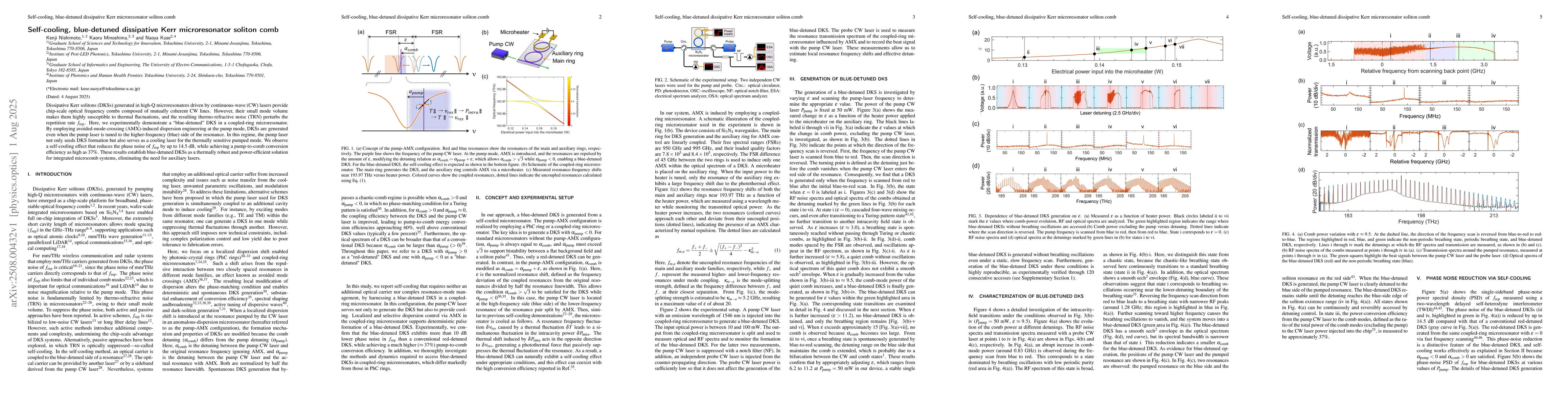 Dissipative Kerr solitons (DKSs) generated in high-Q microresonators driven by continuous-wave (CW) lasers provide chip-scale optical frequency combs composed of mutually coherent CW lines. However, their small mode volume makes them highly susceptible to thermal fluctuations, and the resulting thermo-refractive noise (TRN) perturbs the repetition rate $f_{\rm rep}$. Here, we experimentally demonstrate a blue-detuned DKS in a coupled-ring microresonator. By employing avoided-mode-crossing (AMX)-induced dispersion engineering at the pump mode, DKSs are generated even when the pump laser is tuned to the higher-frequency (blue) side of the resonance. In this regime, the pump laser not only seeds DKS formation but also serves as a cooling laser for the thermally sensitive pumped mode. We observe a self-cooling effect that reduces the phase noise of $f_{\rm rep}$ by up to 14.5 dB, while achieving a pump-to-comb conversion efficiency as high as 37 %. These results establish blue-detuned DKSs as a thermally robust and power-efficient solution for integrated microcomb systems, eliminating the need for auxiliary lasers.