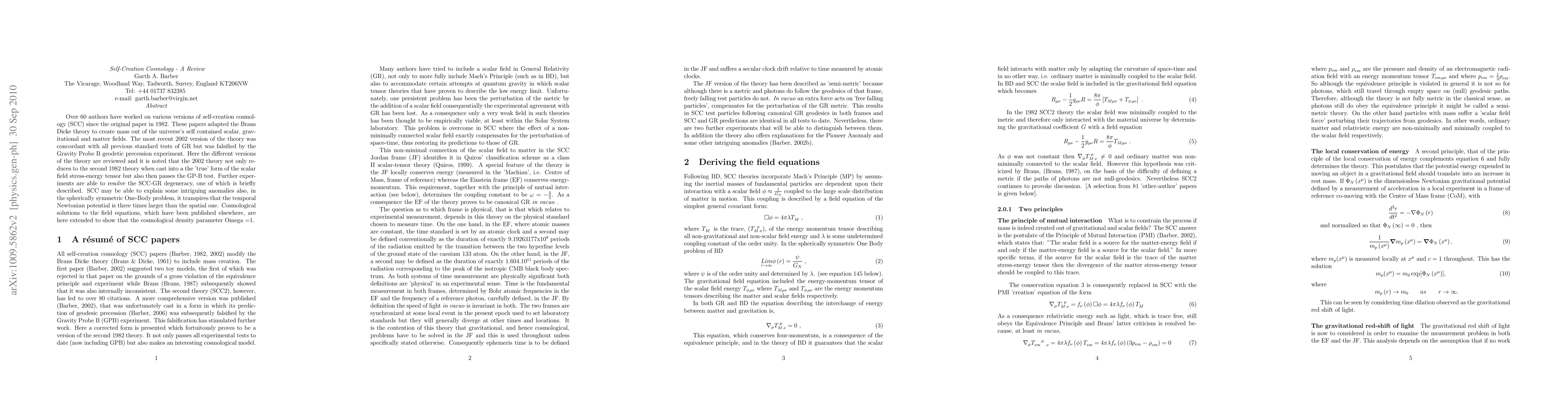 Over 60 authors have worked on various versions of self-creation cosmology (SCC) since the original paper in 1982. These papers adapted the Brans Dicke theory to create mass out of the universe's self contained scalar, gravitational and matter fields. The most recent 2002 version of the theory was concordant with all previous standard tests of GR but was falsified by the Gravity Probe B geodetic precession experiment. Here the different versions of the theory are reviewed and it is noted that the 2002 theory not only reduces to the second 1982 theory when cast into a the 'true' form of the scalar field stress-energy tensor but also in that form it passes the GP-B test. Further experiments are able to resolve the SCC-GR degeneracy, one of which is briefly described. SCC may be able to explain some intriguing anomalies also, in the spherically symmetric One-Body problem, it transpires that the temporal Newtonian potential is three times larger than the spatial one. Cosmological solutions to the field equations, which have been published elsewhere, are extended to show that the cosmological density parameter Omega =1.