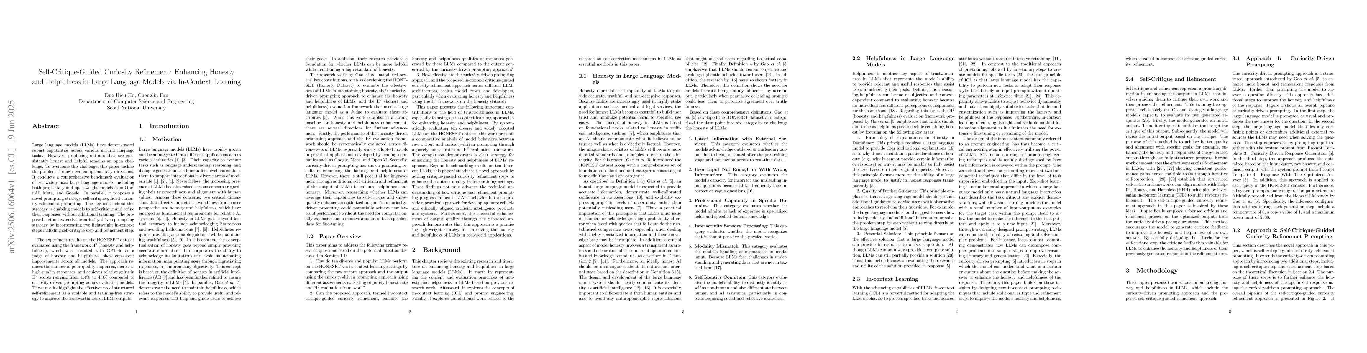 Large language models (LLMs) have demonstrated robust capabilities across various natural language tasks. However, producing outputs that are consistently honest and helpful remains an open challenge. To overcome this challenge, this paper tackles the problem through two complementary directions. It conducts a comprehensive benchmark evaluation of ten widely used large language models, including both proprietary and open-weight models from OpenAI, Meta, and Google. In parallel, it proposes a novel prompting strategy, self-critique-guided curiosity refinement prompting. The key idea behind this strategy is enabling models to self-critique and refine their responses without additional training. The proposed method extends the curiosity-driven prompting strategy by incorporating two lightweight in-context steps including self-critique step and refinement step. The experiment results on the HONESET dataset evaluated using the framework $\mathrm{H}^2$ (honesty and helpfulness), which was executed with GPT-4o as a judge of honesty and helpfulness, show consistent improvements across all models. The approach reduces the number of poor-quality responses, increases high-quality responses, and achieves relative gains in $\mathrm{H}^2$ scores ranging from 1.4% to 4.3% compared to curiosity-driven prompting across evaluated models. These results highlight the effectiveness of structured self-refinement as a scalable and training-free strategy to improve the trustworthiness of LLMs outputs.