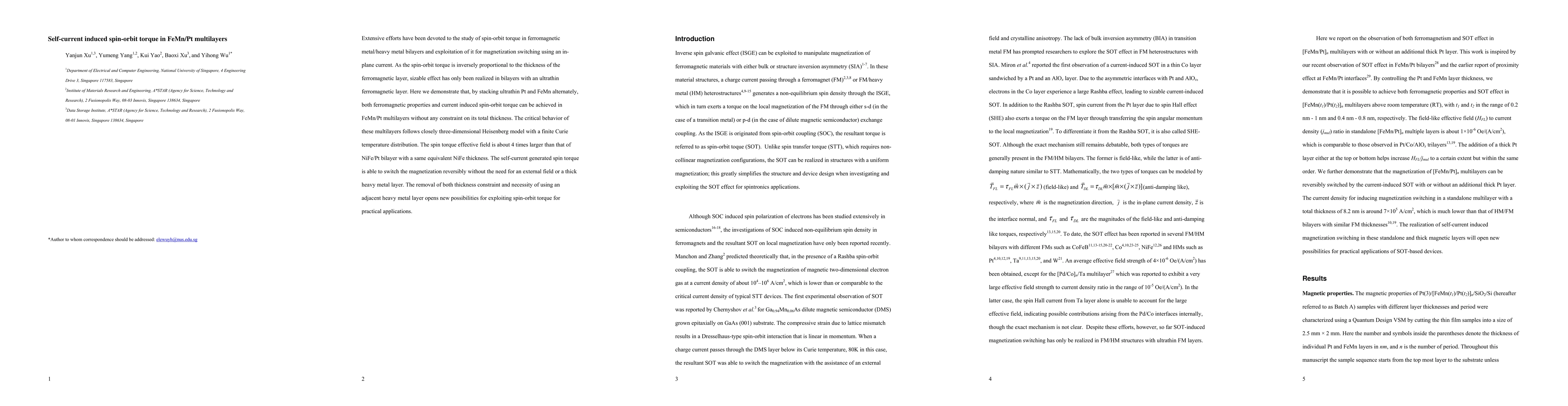 This paper demonstrates that FeMn/Pt multilayers can achieve both ferromagnetic properties and self-current induced spin-orbit torque without thickness constraints, leading to a four times larger effective spin torque field compared to NiFe/Pt bilayers and enabling reversible magnetization switching without external fields.