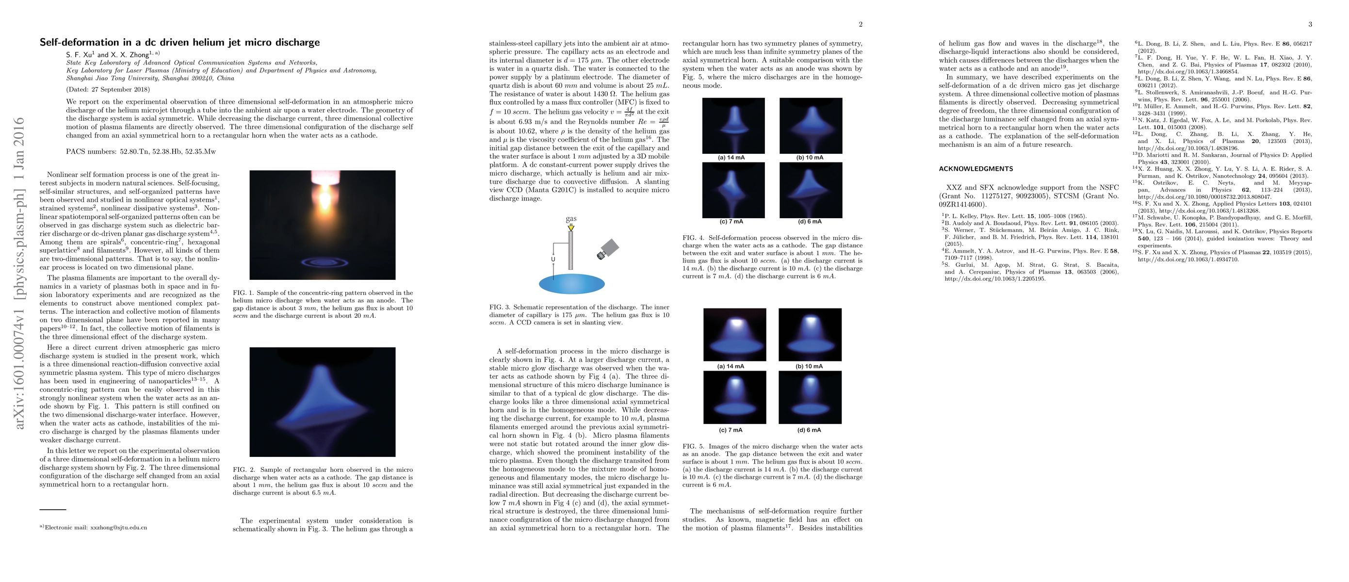 The research employs an experimental setup with a dc-driven helium micro discharge system using a stainless-steel capillary electrode and a water electrode in a quartz dish, under atmospheric pressure. The helium gas flux is controlled at 10 sccm, and the discharge current varies to observe self-deformation processes.