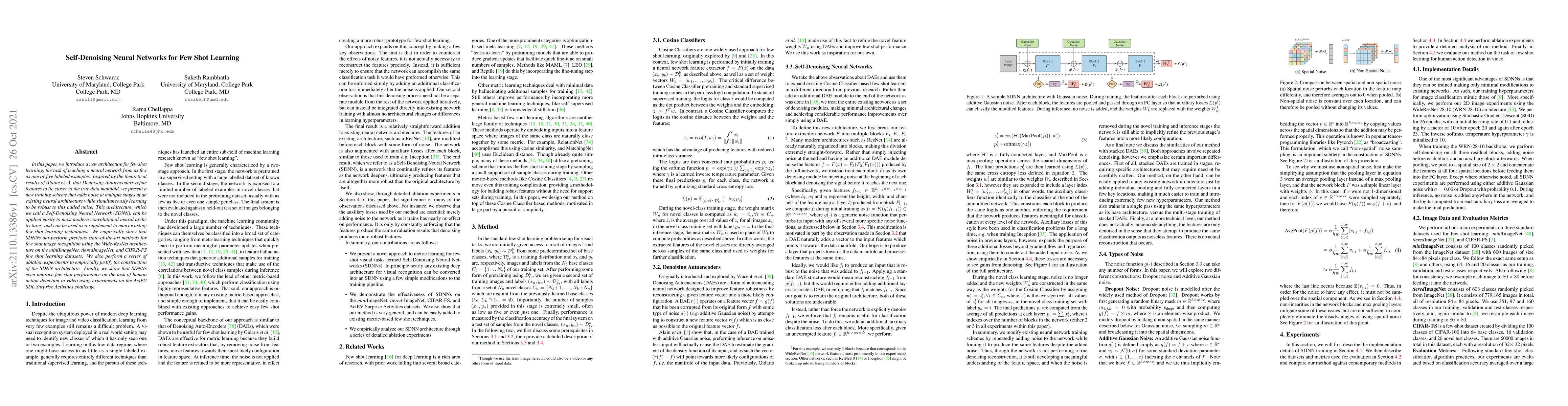 In this paper, we introduce a new architecture for few shot learning, the task of teaching a neural network from as few as one or five labeled examples. Inspired by the theoretical results of Alaine et al that Denoising Autoencoders refine features to lie closer to the true data manifold, we present a new training scheme that adds noise at multiple stages of an existing neural architecture while simultaneously learning to be robust to this added noise. This architecture, which we call a Self-Denoising Neural Network (SDNN), can be applied easily to most modern convolutional neural architectures, and can be used as a supplement to many existing few-shot learning techniques. We empirically show that SDNNs out-perform previous state-of-the-art methods for few shot image recognition using the Wide-ResNet architecture on the \textit{mini}ImageNet, tiered-ImageNet, and CIFAR-FS few shot learning datasets. We also perform a series of ablation experiments to empirically justify the construction of the SDNN architecture. Finally, we show that SDNNs even improve few shot performance on the task of human action detection in video using experiments on the ActEV SDL Surprise Activities challenge.