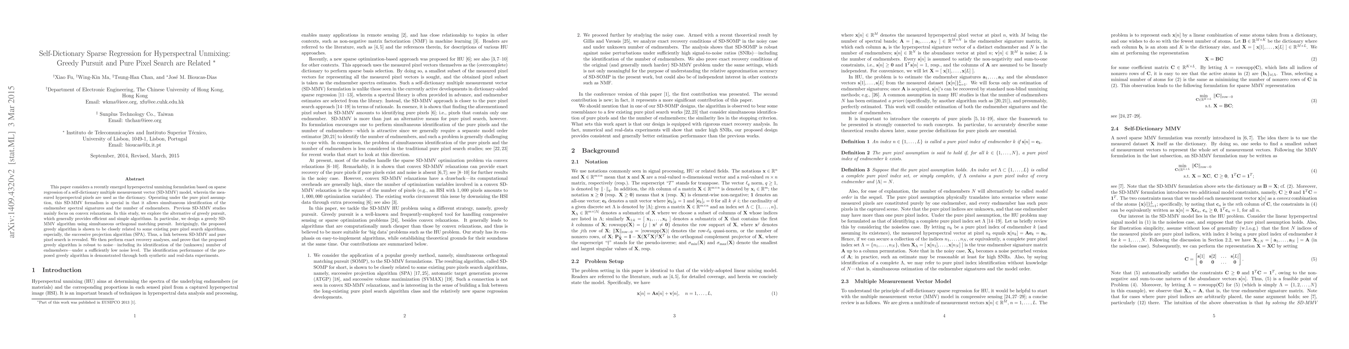 This paper proposes a greedy pursuit algorithm for sparse regression in hyperspectral unmixing using a self-dictionary multiple measurement vector (SD-MMV) model, revealing its close relationship to existing pure pixel search methods like SPA. The algorithm is shown to be robust to noise and effective in identifying the number of endmembers.