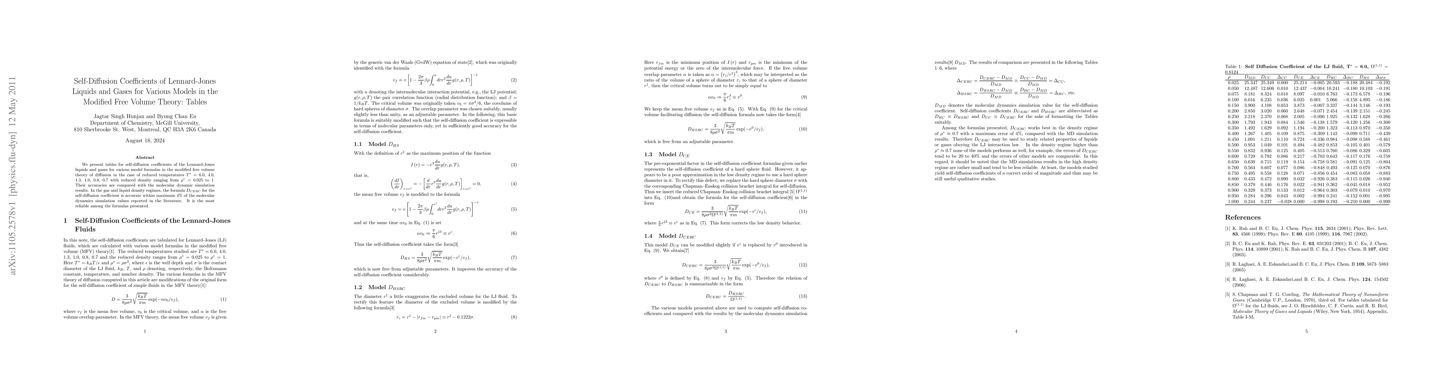 This paper provides tables for self-diffusion coefficients of Lennard-Jones liquids and gases across various models under the modified free volume theory, comparing their accuracy to molecular dynamics simulations. The formula $D_{CERC}$ is found to be the most reliable, accurate within 4% of reported simulation results.