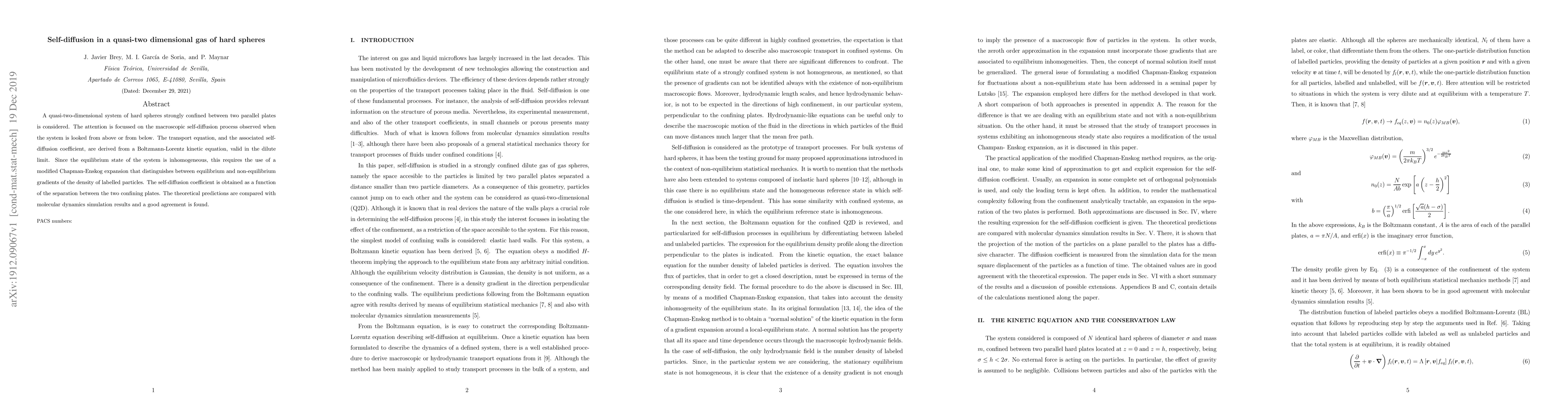 This paper investigates self-diffusion in a quasi-two-dimensional gas of hard spheres confined between parallel plates, deriving a transport equation and self-diffusion coefficient from a Boltzmann-Lorentz kinetic equation. Theoretical predictions align well with molecular dynamics simulations, revealing the dependence of the self-diffusion coefficient on plate separation.