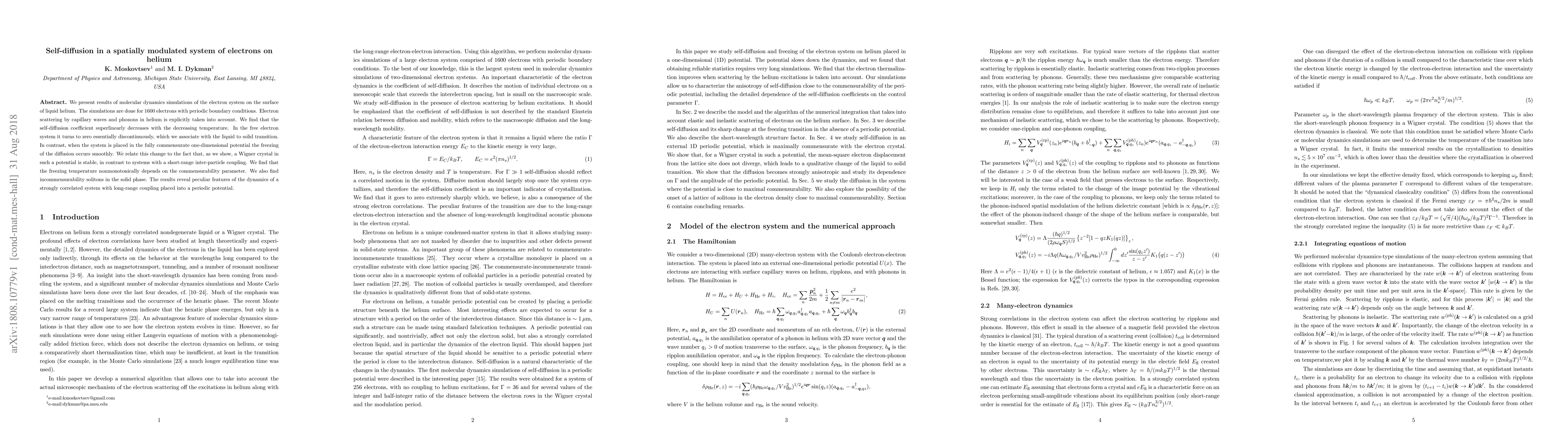 We present results of molecular dynamics simulations of the electron system on the surface of liquid helium. The simulations are done for 1600 electrons with periodic boundary conditions. Electron scattering by capillary waves and phonons in helium is explicitly taken into account. We find that the self-diffusion coefficient superlinearly decreases with the decreasing temperature. In the free electron system it turns to zero essentially discontinuously, which we associate with the liquid to solid transition. In contrast, when the system is placed in the fully commensurate one-dimensional potential the freezing of the diffusion occurs smoothly. We relate this change to the fact that, as we show, a Wigner crystal in such a potential is stable, in contrast to systems with a short-range inter-particle coupling. We find that the freezing temperature nonmonotonically depends on the commensurability parameter. We also find incommensurability solitons in the solid phase. The results reveal peculiar features of the dynamics of a strongly correlated system with long-range coupling placed into a periodic potential.