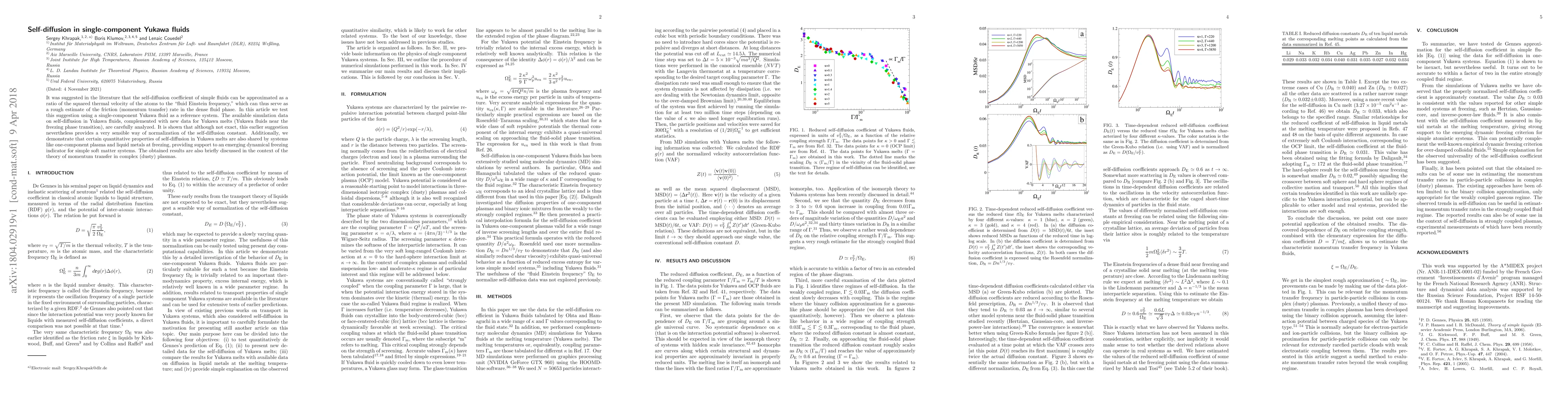 This paper tests the approximation of self-diffusion in dense fluids using a single-component Yukawa fluid, finding that it provides a sensible normalization despite not being exact. It also reveals shared quantitative properties between Yukawa melts and systems like one-component plasma and liquid metals, supporting a dynamical freezing indicator for simple soft matter systems.