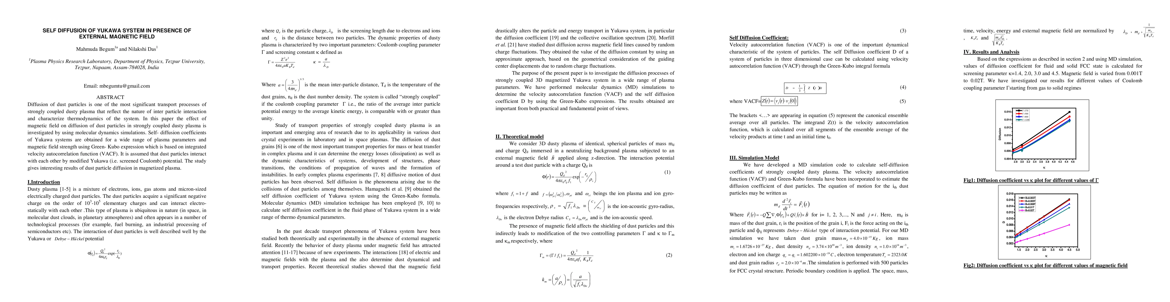 This paper investigates the diffusion of dust particles in strongly coupled dusty plasma under an external magnetic field using molecular dynamics simulations. Results show how varying plasma parameters and magnetic field strength affect the self-diffusion coefficients of Yukawa systems, revealing significant insights into the thermodynamics and interparticle interactions in magnetized plasmas.