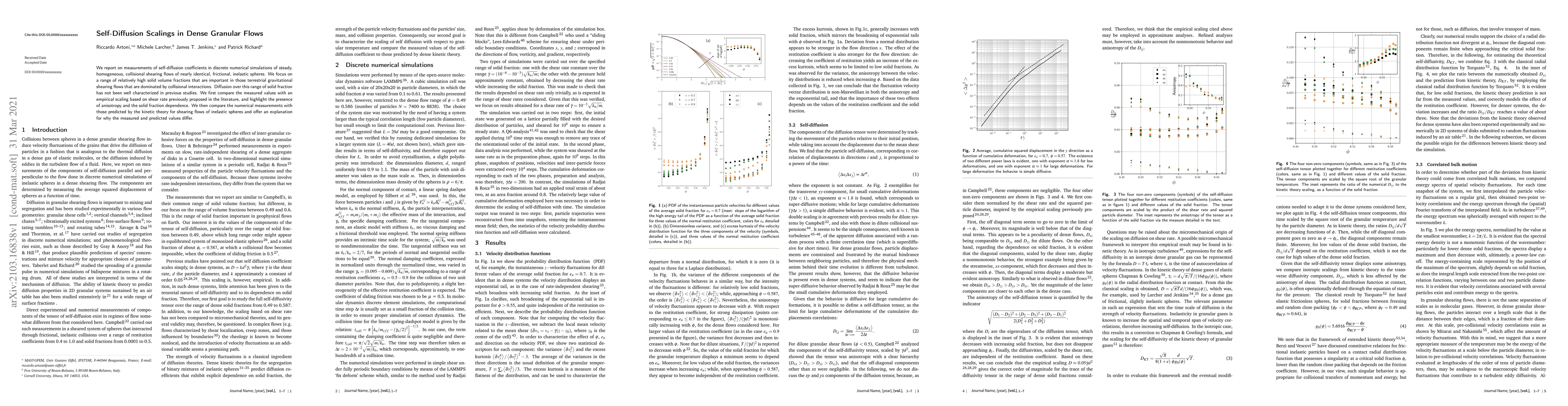 This paper measures self-diffusion coefficients in dense granular flows using numerical simulations, highlighting anisotropy and solid fraction dependence. It compares these findings with empirical and kinetic theory predictions, explaining discrepancies observed.