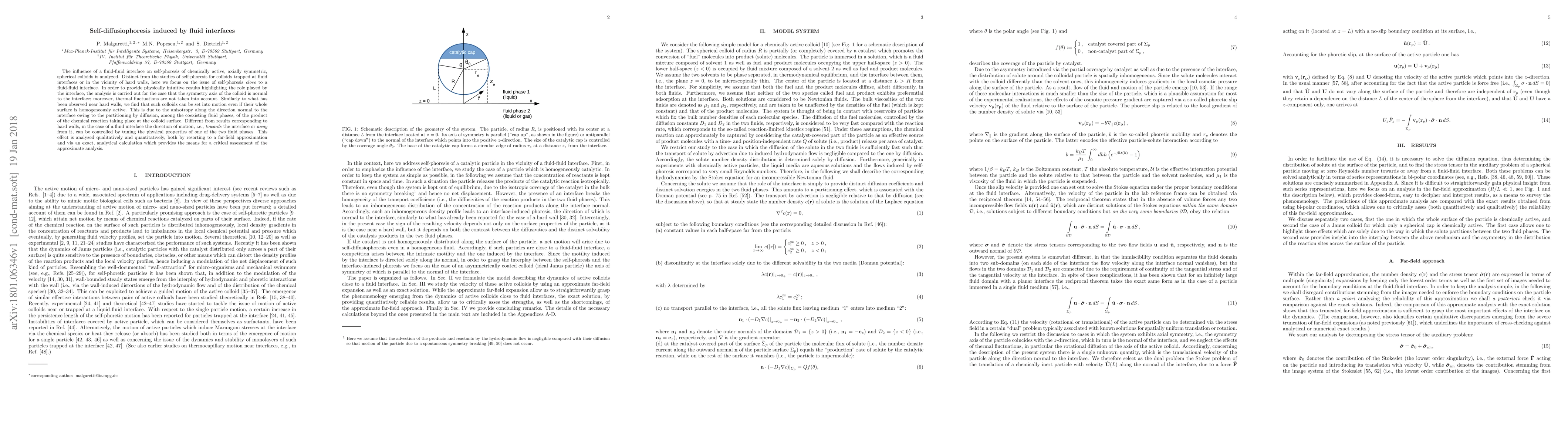 The influence of a fluid-fluid interface on self-phoresis of chemically active, axially symmetric, spherical colloids is analyzed. Distinct from the studies of self-phoresis for colloids trapped at fluid interfaces or in the vicinity of hard walls, here we focus on the issue of self-phoresis close to a fluid-fluid interface. In order to provide physically intuitive results highlighting the role played by the interface, the analysis is carried out for the case that the symmetry axis of the colloid is normal to the interface; moreover, thermal fluctuations are not taken into account. Similarly to what has been observed near hard walls, we find that such colloids can be set into motion even if their whole surface is homogeneously active. This is due to the anisotropy along the direction normal to the interface owing to the partitioning by diffusion, among the coexisting fluid phases, of the product of the chemical reaction taking place at the colloid surface. Different from results corresponding to hard walls, in the case of a fluid interface the direction of motion, i.e., towards the interface or away from it, can be controlled by tuning the physical properties of one of the two fluid phases. This effect is analyzed qualitatively and quantitatively, both by resorting to a far-field approximation and via an exact, analytical calculation which provides the means for a critical assessment of the approximate analysis.