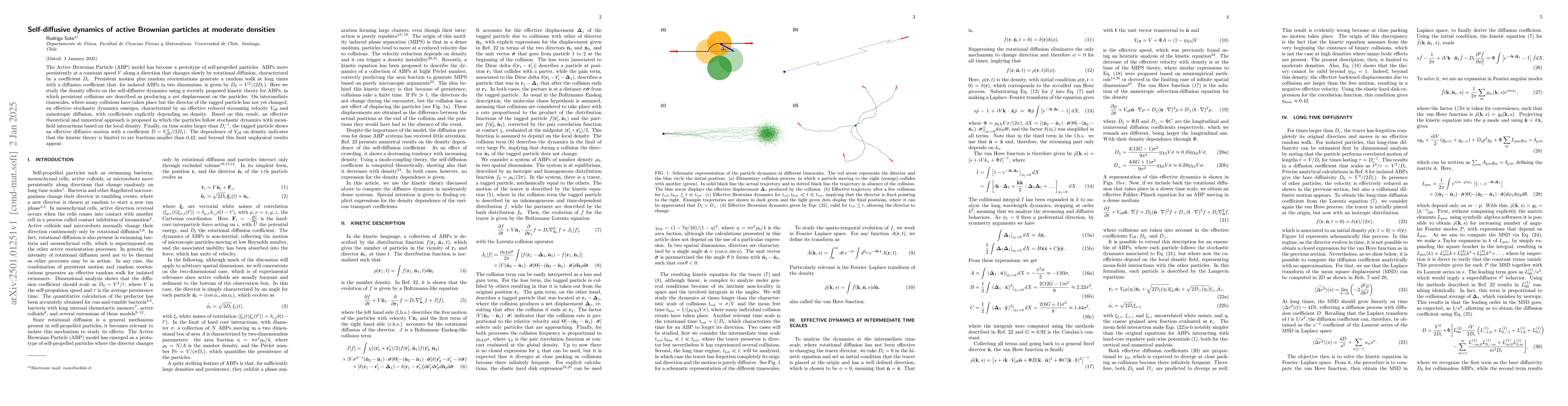 The Active Brownian Particle (ABP) model has become a prototype of self-propelled particles. ABPs move persistently at a constant speed $V$ along a direction that changes slowly by rotational diffusion, characterized by a coefficient $\Dr$. Persistent motion plus random reorientations generate a random walk at long times with a diffusion coefficient that, for isolated ABPs in two dimensions, is given by $D_0=V^2/(2\Dr)$. Here we study the density effects on the self-diffusive dynamics using a recently proposed kinetic theory for ABPs, in which persistent collisions are described as producing a net displacement on the particles. On intermediate timescales, where many collisions have taken place but the director of the tagged particle has not yet changed, an effective stochastic dynamics emerges, characterized by an effective reduced streaming velocity $V_\text{eff}$ and anisotropic diffusion, with coefficients explicitly depending on density. Based on this result, an effective theoretical and numerical approach is proposed in which the particles follow stochastic dynamics with mean-field interactions based on the local density. Finally, on time scales larger than $\Dr^{-1}$, the tagged particle shows an effective diffusive motion with a coefficient $D=V_\text{eff}^2/(2\Dr)$. The dependence of $V_\text{eff}$ on density indicates that the kinetic theory is limited to are fractions smaller than 0.42, and beyond this limit unphysical results appear.