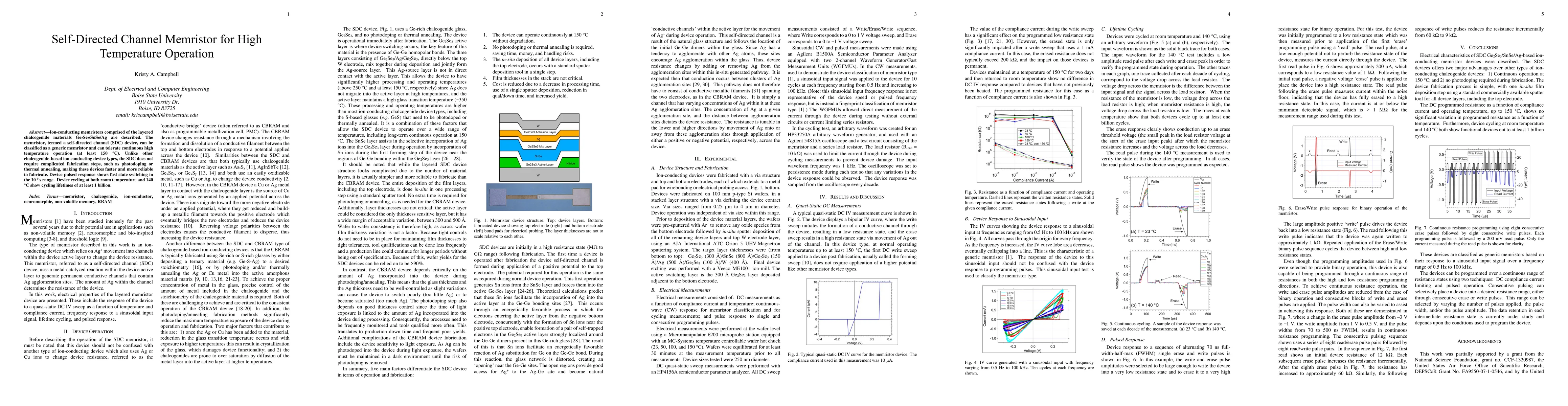 This paper describes a self-directed channel (SDC) memristor made from layered chalcogenide materials that can operate continuously at high temperatures (at least 150°C). The SDC memristor is simpler to fabricate and exhibits fast switching and long cycling lifetimes of over 1 billion cycles.