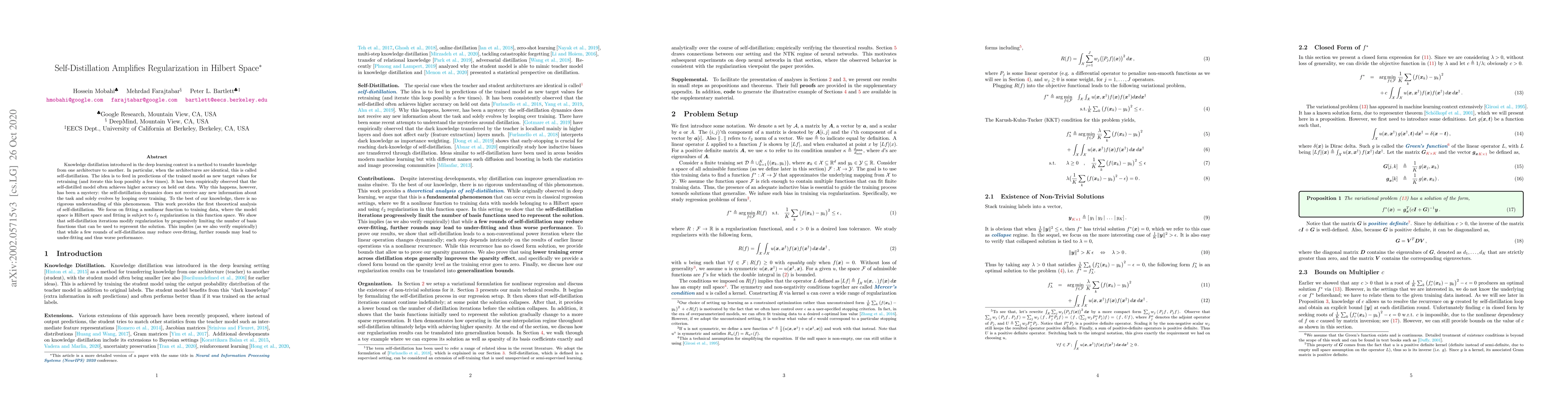 This paper provides the first theoretical analysis of self-distillation, showing that it modifies regularization in Hilbert space by limiting the number of basis functions used, which can enhance performance up to a point before leading to under-fitting. Empirical verification supports these findings.