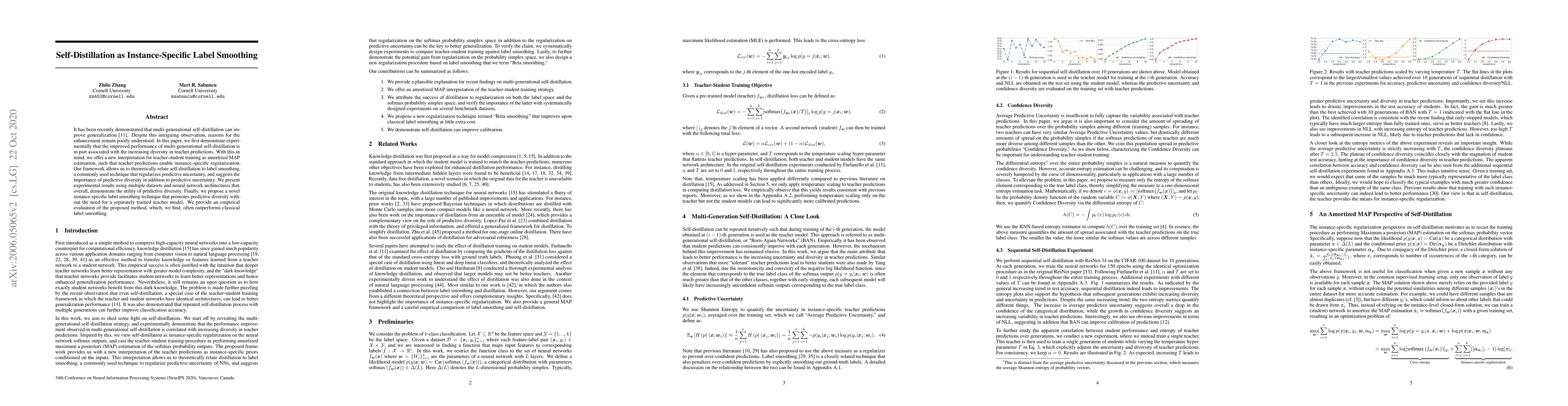 It has been recently demonstrated that multi-generational self-distillation can improve generalization. Despite this intriguing observation, reasons for the enhancement remain poorly understood. In this paper, we first demonstrate experimentally that the improved performance of multi-generational self-distillation is in part associated with the increasing diversity in teacher predictions. With this in mind, we offer a new interpretation for teacher-student training as amortized MAP estimation, such that teacher predictions enable instance-specific regularization. Our framework allows us to theoretically relate self-distillation to label smoothing, a commonly used technique that regularizes predictive uncertainty, and suggests the importance of predictive diversity in addition to predictive uncertainty. We present experimental results using multiple datasets and neural network architectures that, overall, demonstrate the utility of predictive diversity. Finally, we propose a novel instance-specific label smoothing technique that promotes predictive diversity without the need for a separately trained teacher model. We provide an empirical evaluation of the proposed method, which, we find, often outperforms classical label smoothing.