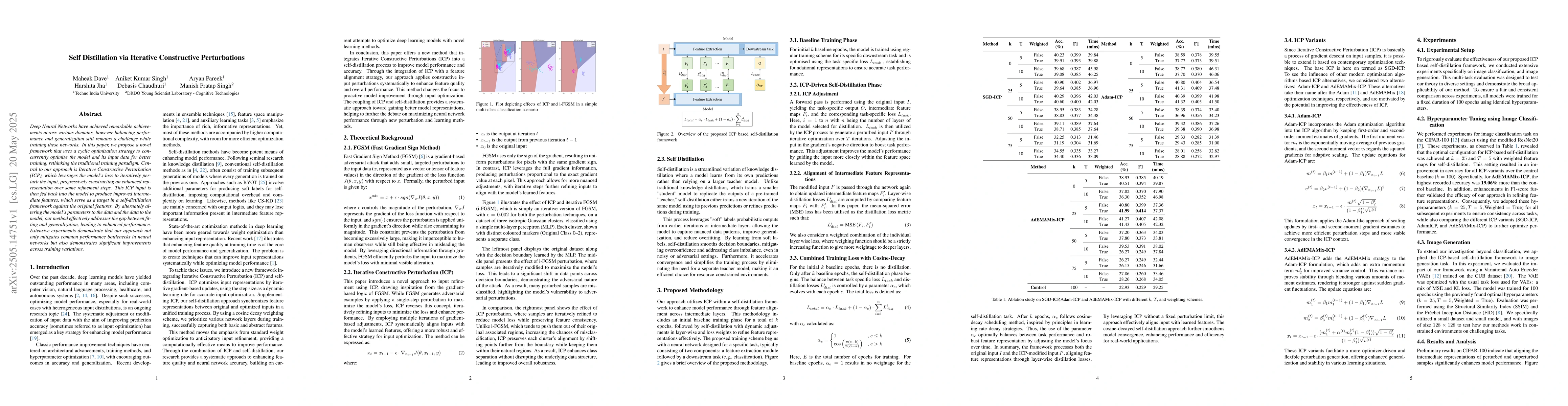 This work is novel by rethinking the traditional training paradigm, proposing a self-distillation method that alternately refines both model parameters and input data using ICP, thereby enhancing performance and generalization.