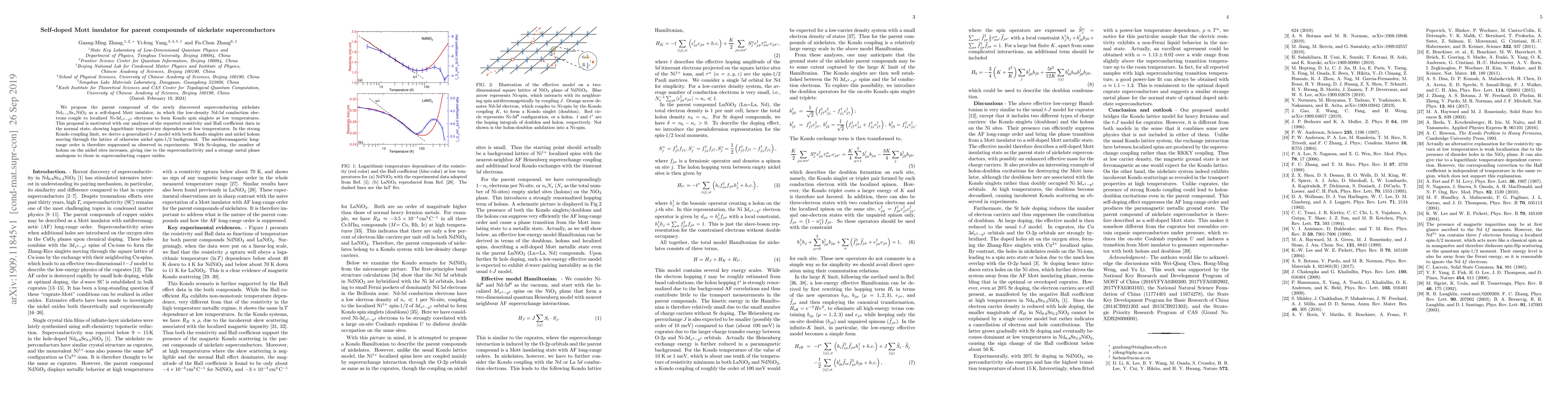 We propose the parent compound of the newly discovered superconducting nickelate Nd$_{1-x}$Sr$_{x}$NiO$_{2}$ as a self-doped Mott insulator, in which the low-density Nd-$5d$ conduction electrons couple to localized Ni-3$% d_{x^{2}-y^{2}}$ electrons to form Kondo spin singlets at low temperatures. This proposal is motivated with our analyses of the reported resistivity and Hall coefficient data in the normal state, showing logarithmic temperature dependence at low temperatures. In the strong Kondo coupling limit, we derive a generalized $t$-$J$ model with both Kondo singlets and nickel holons moving through the lattice of otherwise nickel spin-1/2 background. The antiferromagnetic long-range order is therefore suppressed as observed in experiments. With Sr-doping, the number of holons on the nickel sites increases, giving rise to the superconductivity and a strange metal phase analogous to those in superconducting copper oxides.