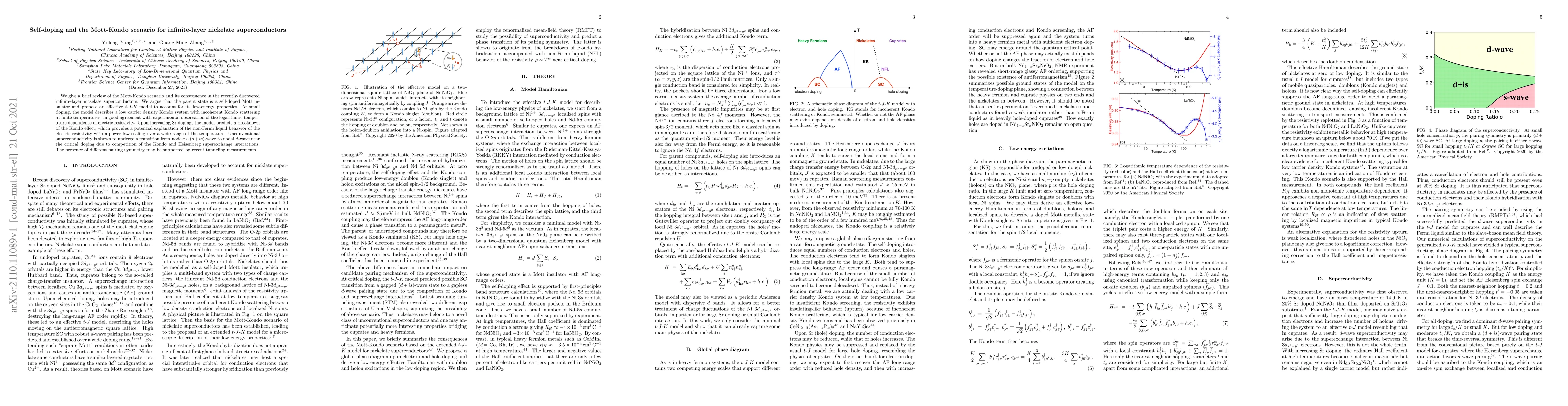 We give a brief review of the Mott-Kondo scenario and its consequence in the recently-discovered infinite-layer nickelate superconductors. We argue that the parent state is a self-doped Mott insulator and propose an effective $t$-$J$-$K$ model to account for its low-energy properties. At small doping, the model describes a low carrier density Kondo system with incoherent Kondo scattering at finite temperatures, in good agreement with experimental observation of the logarithmic temperature dependence of electric resistivity. Upon increasing Sr doping, the model predicts a breakdown of the Kondo effect, which provides a potential explanation of the non-Fermi liquid behavior of the electric resistivity with a power law scaling over a wide range of the temperature. Unconventional superconductivity is shown to undergo a transition from nodeless $(d+is)$-wave to nodal $d$-wave near the critical doping due to competition of the Kondo and Heisenberg superexchange interactions. The presence of different pairing symmetry may be supported by recent tunneling measurements.
