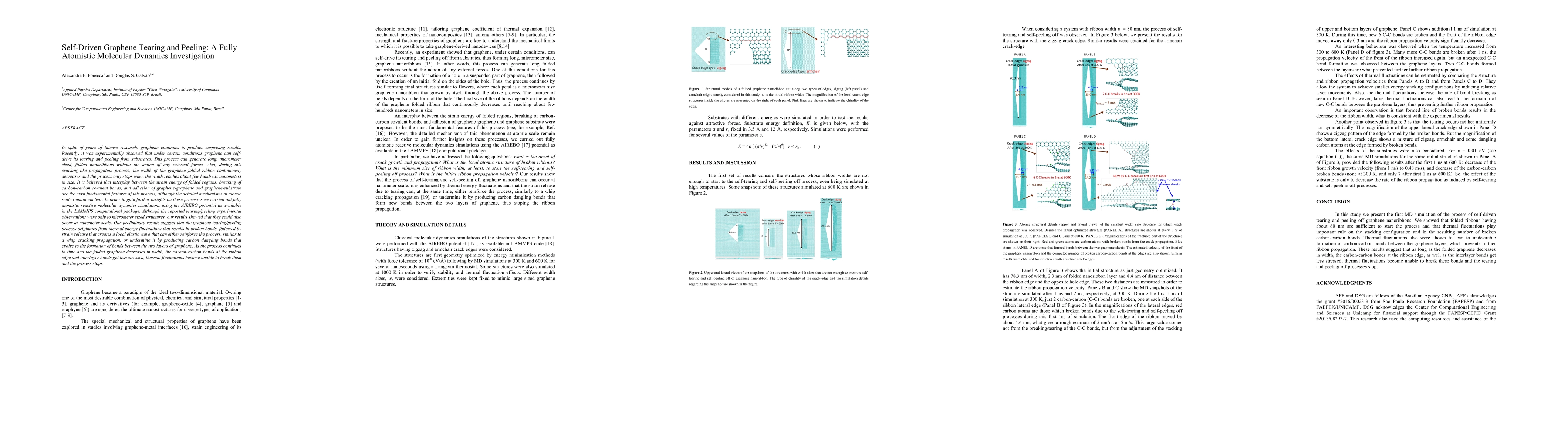 In spite of years of intense research, graphene continues to produce surprising results. Recently, it was experimentally observed that under certain conditions graphene can self-drive its tearing and peeling from substrates. This process can generate long, micrometer sized, folded nanoribbons without the action of any external forces. Also, during this cracking-like propagation process, the width of the graphene folded ribbon continuously decreases and the process only stops when the width reaches about few hundreds nanometers in size. It is believed that interplay between the strain energy of folded regions, breaking of carbon-carbon covalent bonds, and adhesion of graphene-graphene and graphene-substrate are the most fundamental features of this process, although the detailed mechanisms at atomic scale remain unclear. In order to gain further insights on these processes we carried out fully atomistic reactive molecular dynamics simulations using the AIREBO potential as available in the LAMMPS computational package. Although the reported tearing/peeling experimental observations were only to micrometer sized structures, our results showed that they could also occur at nanometer scale. Our preliminary results suggest that the graphene tearing/peeling process originates from thermal energy fluctuations that results in broken bonds, followed by strain release that creates a local elastic wave that can either reinforce the process, similar to a whip cracking propagation, or undermine it by producing carbon dangling bonds that evolve to the formation of bonds between the two layers of graphene. As the process continues in time and the folded graphene decreases in width, the carbon-carbon bonds at the ribbon edge and interlayer bonds get less stressed, thermal fluctuations become unable to break them and the process stops.