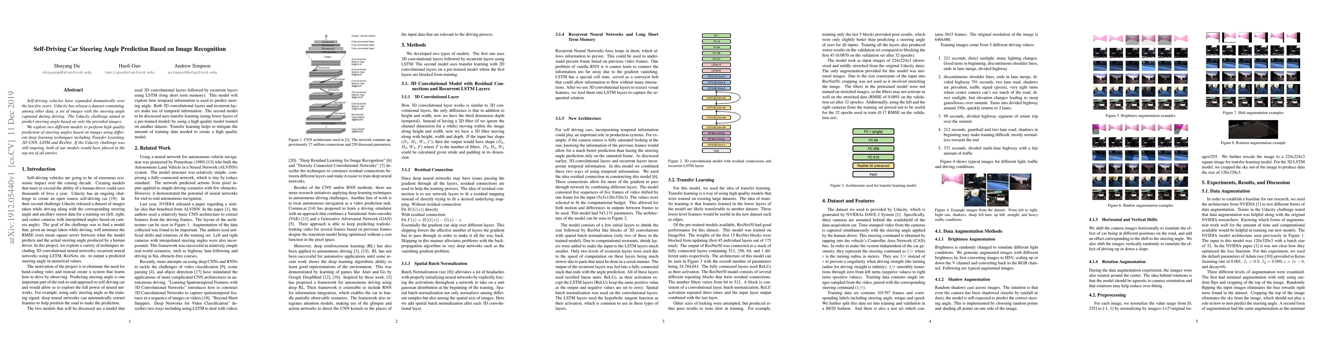 Summary: This paper investigates two deep learning models for predicting steering angles in self-driving cars using image recognition, employing techniques like Transfer Learning, 3D CNN, LSTM, and ResNet. The authors assert that their models would rank in the top ten in the Udacity self-driving car challenge.