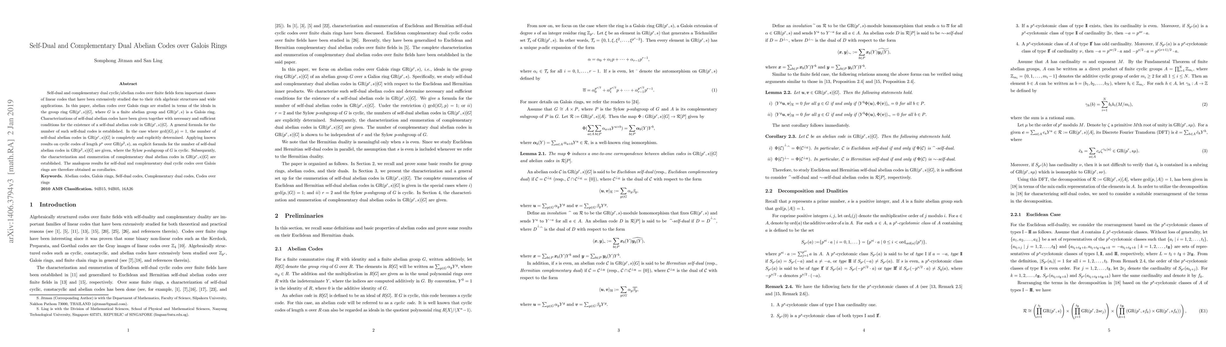 Self-dual and complementary dual cyclic/abelian codes over finite fields form important classes of linear codes that have been extensively studied due to their rich algebraic structures and wide applications. In this paper, abelian codes over Galois rings are studied in terms of the ideals in the group ring ${\rm GR}(p^r,s)[G]$, where $G$ is a finite abelian group and ${\rm GR}(p^r,s)$ is a Galois ring. Characterizations of self-dual abelian codes have been given together with necessary and sufficient conditions for the existence of a self-dual abelian code in ${\rm GR}(p^r,s)[G]$. A general formula for the number of such self-dual codes is established. In the case where $\gcd(|G|,p)=1$, the number of self-dual abelian codes in ${\rm GR}(p^r,s)[G]$ is completely and explicitly determined. Applying known results on cyclic codes of length $p^a$ over ${\rm GR}(p^2,s)$, an explicit formula for the number of self-dual abelian codes in ${\rm GR}(p^2,s)[G]$ are given, where the Sylow $p$-subgroup of $G$ is cyclic. Subsequently, the characterization and enumeration of complementary dual abelian codes in ${\rm GR}(p^r,s)[G]$ are established. The analogous results for self-dual and complementary dual cyclic codes over Galois rings are therefore obtained as corollaries.