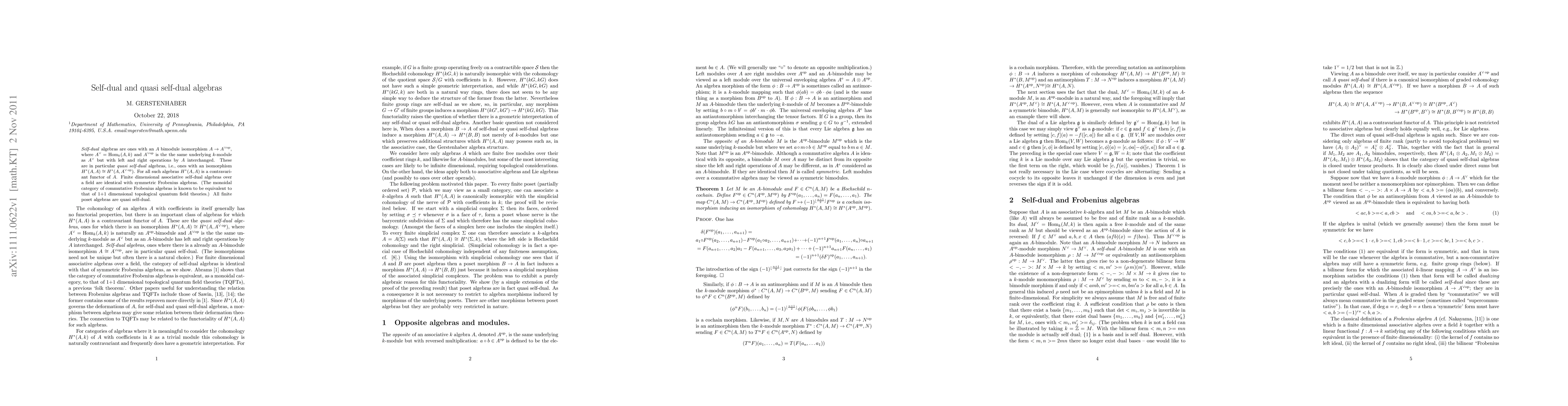 A self-dual algebras is one isomorphic as a module to the opposite of its dual; a quasi self-dual algebra is one whose cohomology with coefficients in itself is isomorphic to that with coefficients in the opposite of its dual. For these algebras, cohomology with coefficients in itself, which governs its deformation theory, is a contravariant functor of the algebra. Finite dimensional self-dual algebras over a field are identical with symmetric Frobenius algebras. (The monoidal category of commutative Frobenius algebras is known to be equivalent to that of 1+1 dimensional topological quantum field theories.) All finite poset algebras are quasi self-dual.