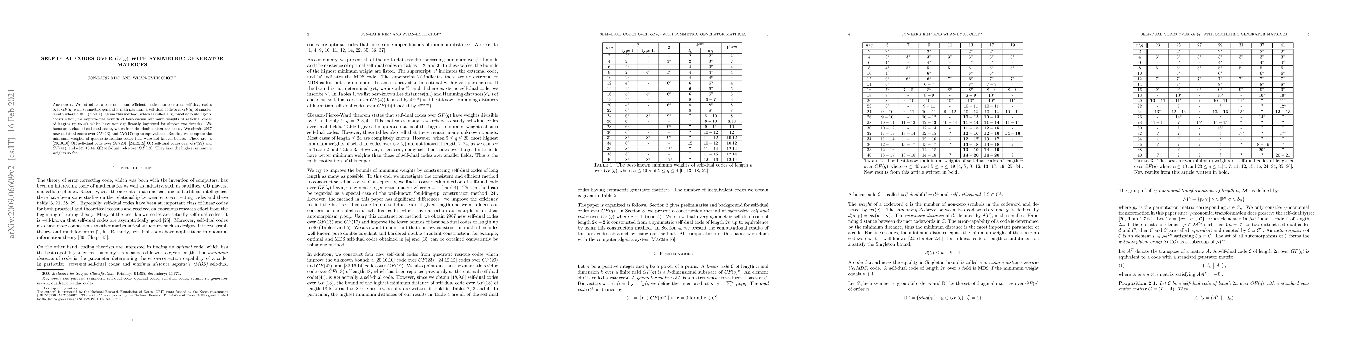 We introduce a consistent and efficient method to construct self-dual codes over $GF(q)$ with symmetric generator matrices from a self-dual code over $GF(q)$ of smaller length where $q \equiv 1 \pmod 4$. Using this method, we improve the best-known minimum weights of self-dual codes, which have not significantly improved for almost two decades. We focus on a class of self-dual codes, including double circulant codes. Using our method, called a `symmetric building-up' construction, we obtain many new self-dual codes over $GF(13)$ and $GF(17)$ and improve the bounds of best-known minimum weights of self-dual codes of lengths up to 40. Besides, we compute the minimum weights of quadratic residue codes that were not known before. These are: a [20,10,10] QR self-dual code over $GF(23)$, two [24,12,12] QR self-dual codes over $GF(29)$ and $GF(41)$, and a [32,12,14] QR self-dual codes over $GF(19)$. They have the highest minimum weights so far.