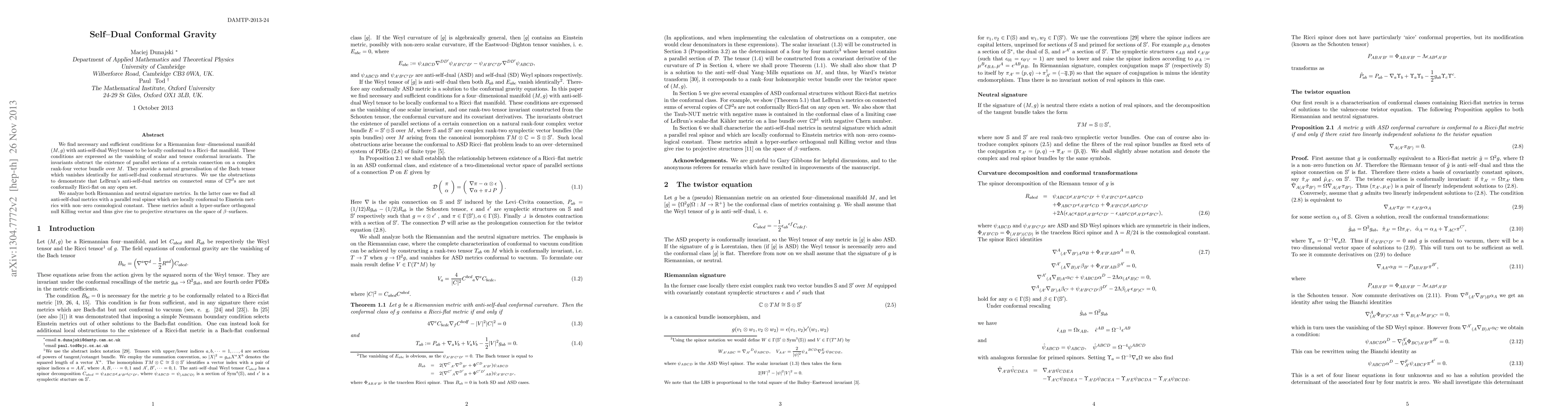We find necessary and sufficient conditions for a Riemannian four-dimensional manifold $(M, g)$ with anti-self-dual Weyl tensor to be locally conformal to a Ricci--flat manifold. These conditions are expressed as the vanishing of scalar and tensor conformal invariants. The invariants obstruct the existence of parallel sections of a certain connection on a complex rank-four vector bundle over $M$. They provide a natural generalisation of the Bach tensor which vanishes identically for anti-self-dual conformal structures. We use the obstructions to demonstrate that LeBrun's anti-self-dual metrics on connected sums of $\CP^2$s are not conformally Ricci-flat on any open set. We analyze both Riemannian and neutral signature metrics. In the latter case we find all anti-self-dual metrics with a parallel real spinor which are locally conformal to Einstein metrics with non-zero cosmological constant. These metrics admit a hyper-surface orthogonal null Killing vector and thus give rise to projective structures on the space of $\beta$-surfaces.