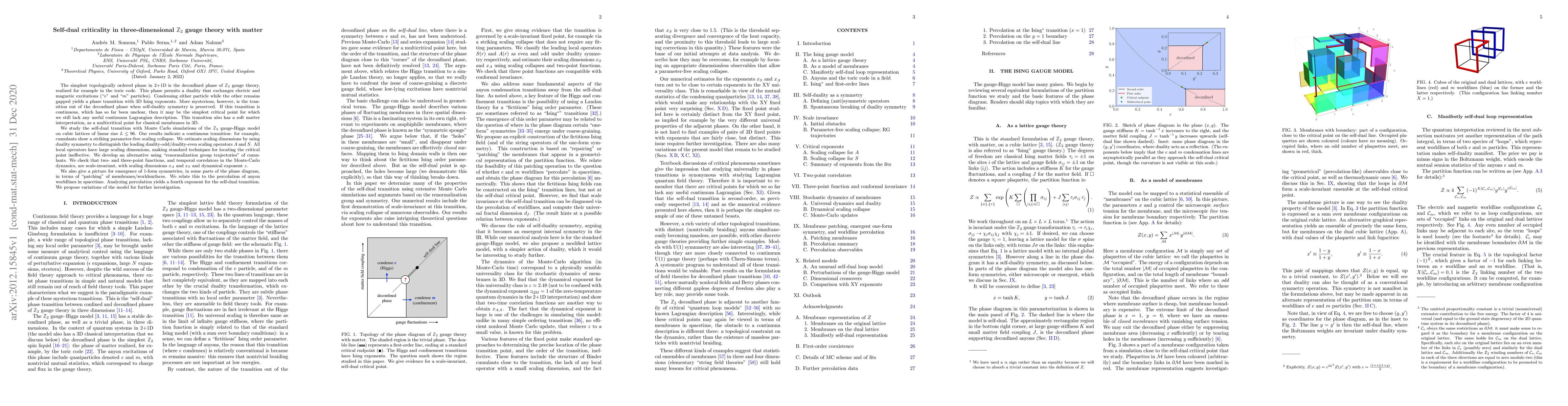 The simplest topologically ordered phase in 2+1D is the deconfined phase of $Z_2$ gauge theory, realized for example in the toric code. This phase permits a duality that exchanges electric and magnetic excitations (``$e$'' and ``$m$'' particles). Condensing either particle while the other remains gapped yields a phase transition with 3D Ising exponents. More mysterious, however, is the transition out of the deconfined phase when self-duality symmetry is preserved. If this transition is continuous, which has so far been unclear, then it may be the simplest critical point for which we still lack any useful continuum Lagrangian description. This transition also has a soft matter interpretation, as a multicritical point for classical membranes in 3D. We study the self-dual transition with Monte Carlo simulations of the $Z_2$ gauge-Higgs model on cubic lattices of linear size $L\leq 96$. Our results indicate a continuous transition: for example, cumulants show a striking parameter-free scaling collapse. We estimate scaling dimensions by using duality symmetry to distinguish the leading duality-odd/duality-even scaling operators $A$ and $S$. All local operators have large scaling dimensions, making standard techniques for locating the critical point ineffective. We develop an alternative using ``renormalization group trajectories'' of cumulants. We check that two- and three-point functions, and temporal correlators in the Monte-Carlo dynamics, are scale-invariant, with scaling dimensions $x_A$ and $x_S$ and dynamical exponent $z$. We also give a picture for emergence of 1-form symmetries, in some parts of the phase diagram, in terms of ``patching'' of membranes/worldsurfaces. We relate this to the percolation of anyon worldlines in spacetime. Analyzing percolation yields a fourth exponent for the self-dual transition. We propose variations of the model for further investigation.