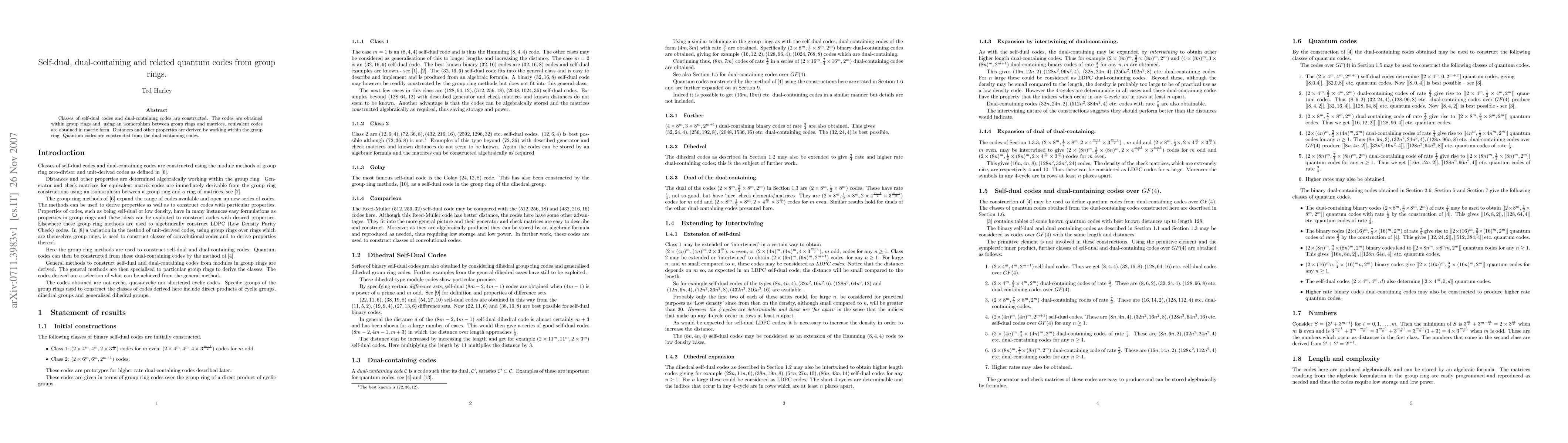 Classes of self-dual codes and dual-containing codes are constructed. The codes are obtained within group rings and, using an isomorphism between group rings and matrices, equivalent codes are obtained in matrix form. Distances and other properties are derived by working within the group ring. Quantum codes are constructed from the dual-containing codes.