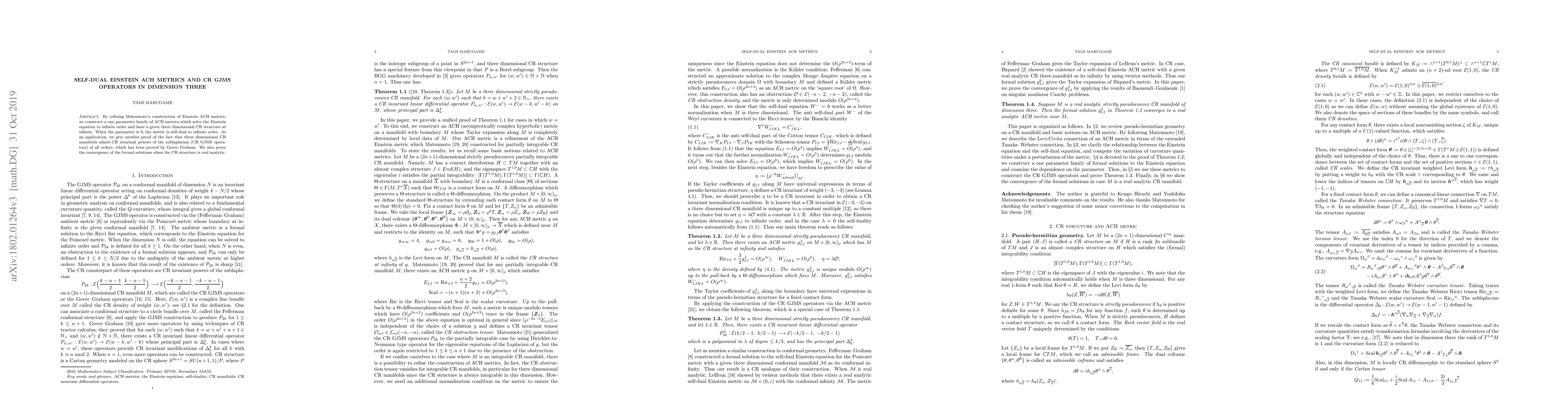 This research presents a new method to construct self-dual Einstein ACH (asymptotically complex hyperbolic) metrics in three dimensions with specified CR (CR stands for Cauchy-Riemann) structures at infinity. By refining Matsumoto's construction, these metrics solve the Einstein equation to infinite order. As an application, the study provides an alternative proof of the existence of CR GJMS (Graham-Jenne) operators for all orders on three-dimensional CR manifolds, previously shown by Gover and Graham. Additionally, the paper proves the convergence of these formal solutions for real analytic CR structures.