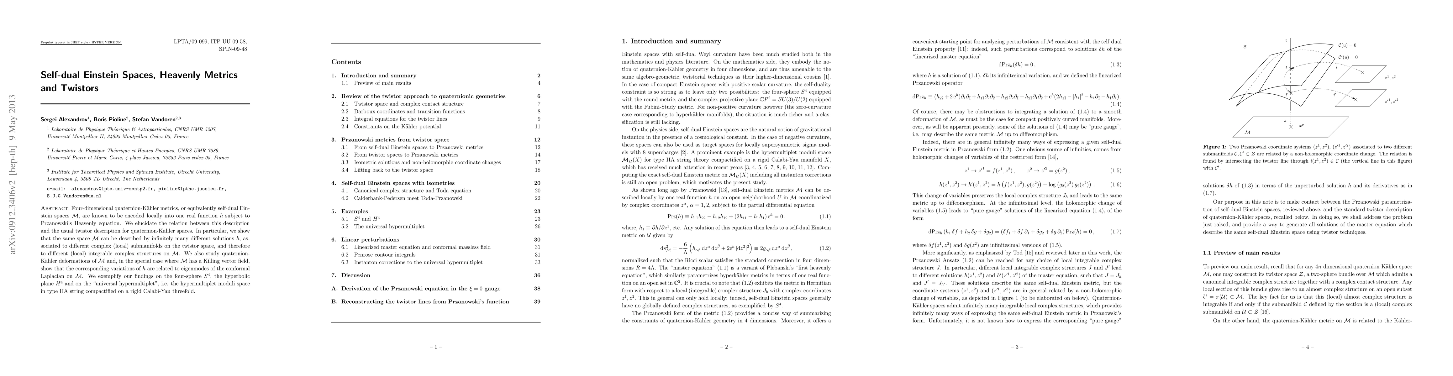 This paper explores the relationship between self-dual Einstein spaces and their twistor descriptions, showing that these spaces can be represented by multiple solutions to Przanowski's Heavenly equation linked to different complex structures. It also examines quaternion-Kahler deformations and their relation to conformal Laplacian eigenmodes.