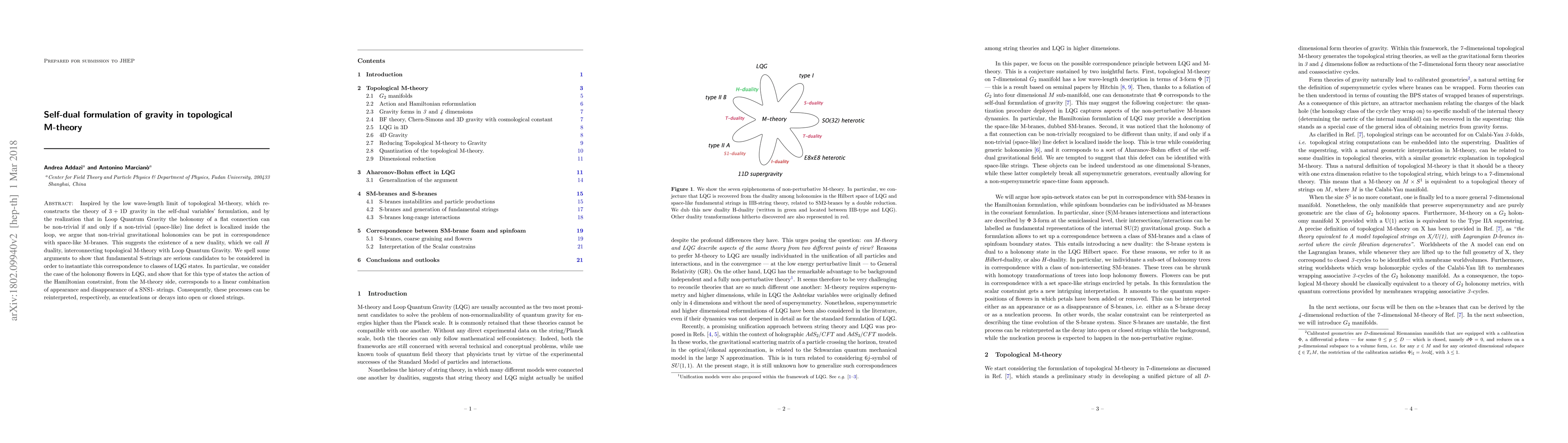 Inspired by the low wave-length limit of topological M-theory, which re-constructs the theory of $3+1$D gravity in the self-dual variables' formulation, and by the realization that in Loop Quantum Gravity the holonomy of a flat connection can be non-trivial if and only if a non-trivial (space-like) line defect is localized inside the loop, we argue that non-trivial gravitational holonomies can be put in correspondence with space-like M-branes. This suggests the existence of a new duality, which we call $H$ duality, interconnecting topological M-theory with Loop Quantum Gravity. We spell some arguments to show that fundamental S-strings are serious candidates to be considered in order to instantiate this correspondence to classes of LQG states. In particular, we consider the case of the holonomy flowers in LQG, and show that for this type of states the action of the Hamiltonian constraint, from the M-theory side, corresponds to a linear combination of appearance and disappearance of a SNS1- strings. Consequently, these processes can be reinterpreted, respectively, as enucleations or decays into open or closed strings.