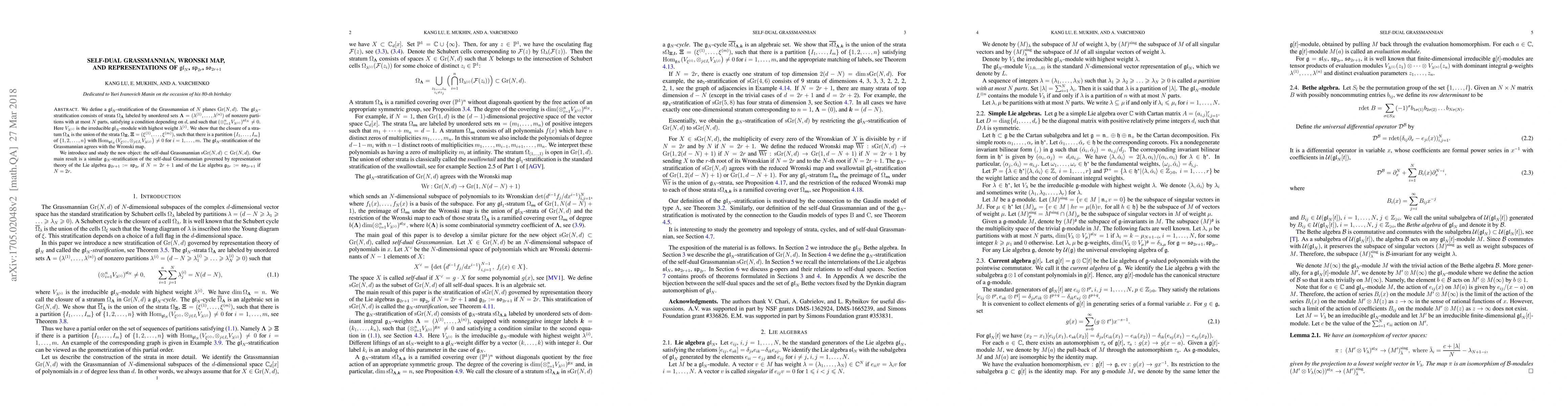 We define a $\mathfrak{gl}_N$-stratification of the Grassmannian of $N$ planes $\mathrm{Gr}(N,d)$. The $\mathfrak{gl}_N$-stratification consists of strata $\Omega_{\mathbf{\Lambda}}$ labeled by unordered sets $\mathbf{\Lambda}=(\lambda^{(1)},\dots,\lambda^{(n)})$ of nonzero partitions with at most $N$ parts, satisfying a condition depending on $d$, and such that $(\otimes_{i=1}^n V_{\lambda^{(i)}})^{\mathfrak{sl}_N}\ne 0$. Here $V_{\lambda^{(i)}}$ is the irreducible $\mathfrak{gl}_N$-module with highest weight $\lambda^{(i)}$. We show that the closure of a stratum $\Omega_{\mathbf{\Lambda}}$ is the union of the strata $\Omega_{\mathbf\Xi}$, $\mathbf{\Xi}=(\xi^{(1)},\dots,\xi^{(m)})$, such that there is a partition $\{I_1,\dots,I_m\}$ of $\{1,2,\dots,n\}$ with $ {\rm {Hom}}_{\mathfrak{gl}_N} (V_{\xi^{(i)}}, \otimes_{j\in I_i}V_{\lambda^{(j)}}\big)\neq 0$ for $i=1,\dots,m$. The $\mathfrak{gl}_N$-stratification of the Grassmannian agrees with the Wronski map. We introduce and study the new object: the self-dual Grassmannian $\mathrm{sGr}(N,d)\subset \mathrm{Gr}(N,d)$. Our main result is a similar $\mathfrak{g}_N$-stratification of the self-dual Grassmannian governed by representation theory of the Lie algebra $\mathfrak {g}_{2r+1}:=\mathfrak{sp}_{2r}$ if $N=2r+1$ and of the Lie algebra $\mathfrak g_{2r}:=\mathfrak{so}_{2r+1}$ if $N=2r$.