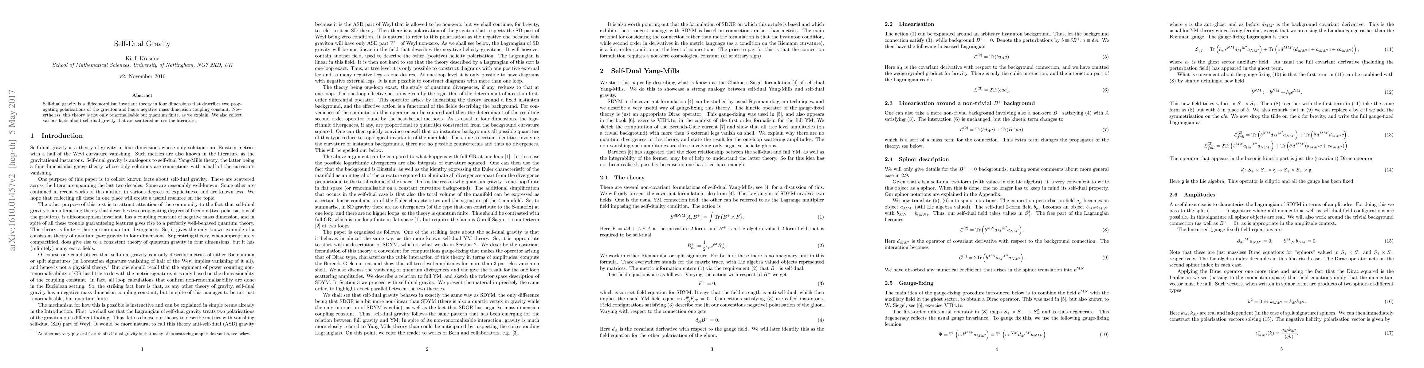 Self-dual gravity is a renormalizable and quantum finite diffeomorphism invariant theory in four dimensions, featuring two graviton polarizations and a unique negative mass dimension coupling constant. This paper consolidates various scattered facts about the theory from the literature.