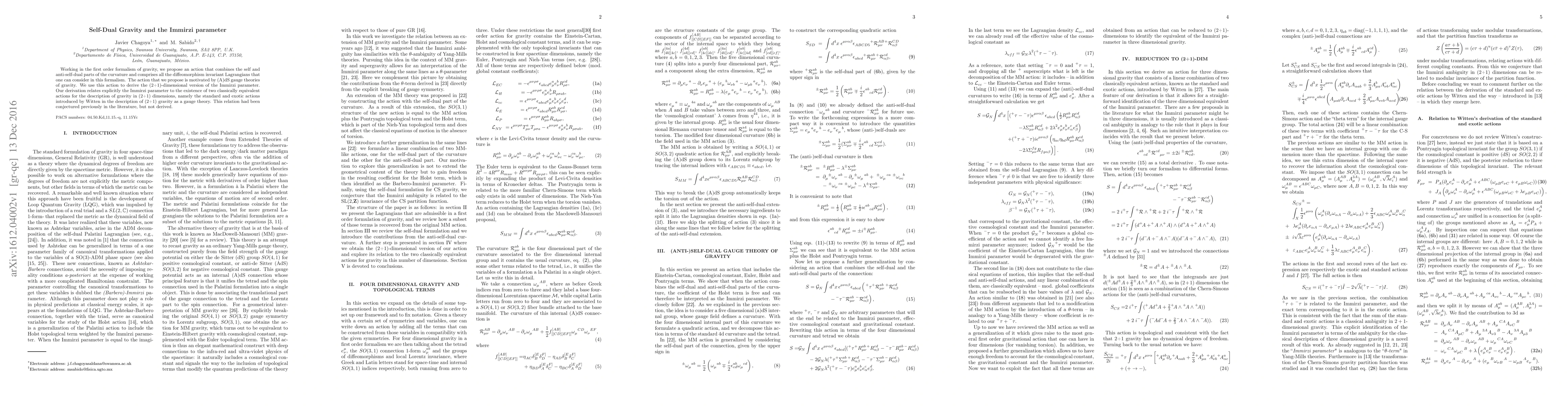 This paper proposes a new action in the first-order formalism of gravity that combines self-dual and anti-self-dual curvature components, leading to a derivation of the (2+1)-dimensional Immirzi parameter. The authors explicitly connect the Immirzi parameter to the existence of two classically equivalent gravity actions in (2+1) dimensions, resolving a previous conjecture.