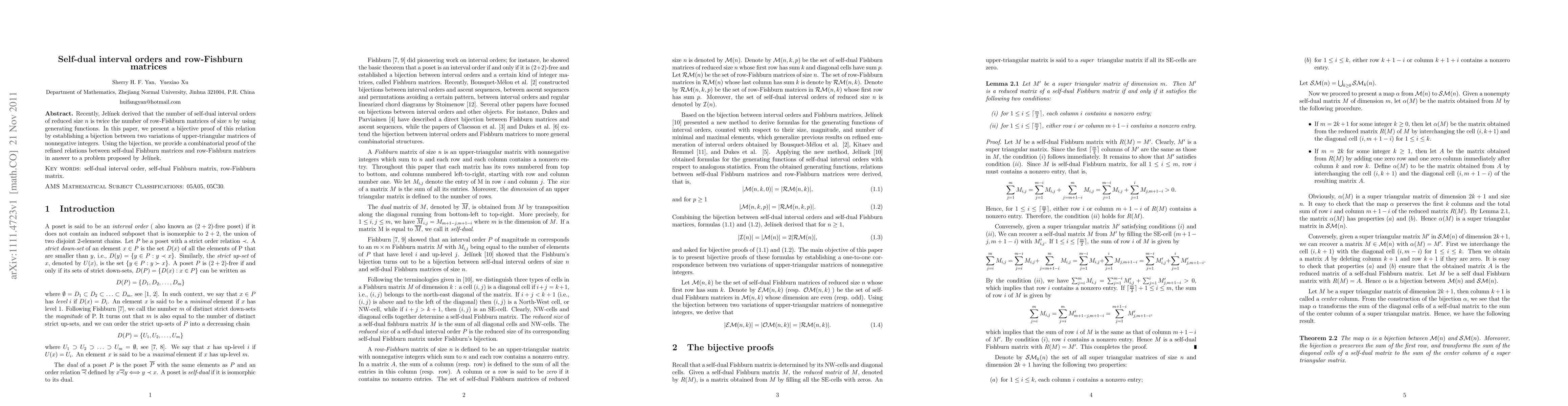 Recently, Jel\'{i}nek derived that the number of self-dual interval orders of reduced size $n$ is twice the number of row-Fishburn matrices of size $n$ by using generating functions. In this paper, we present a bijective proof of this relation by establishing a bijection between two variations of upper-triangular matrices of nonnegative integers. Using the bijection, we provide a combinatorial proof of the refined relations between self-dual Fishburn matrices and row-Fishburn matrices in answer to a problem proposed by Jel\'{i}nek.